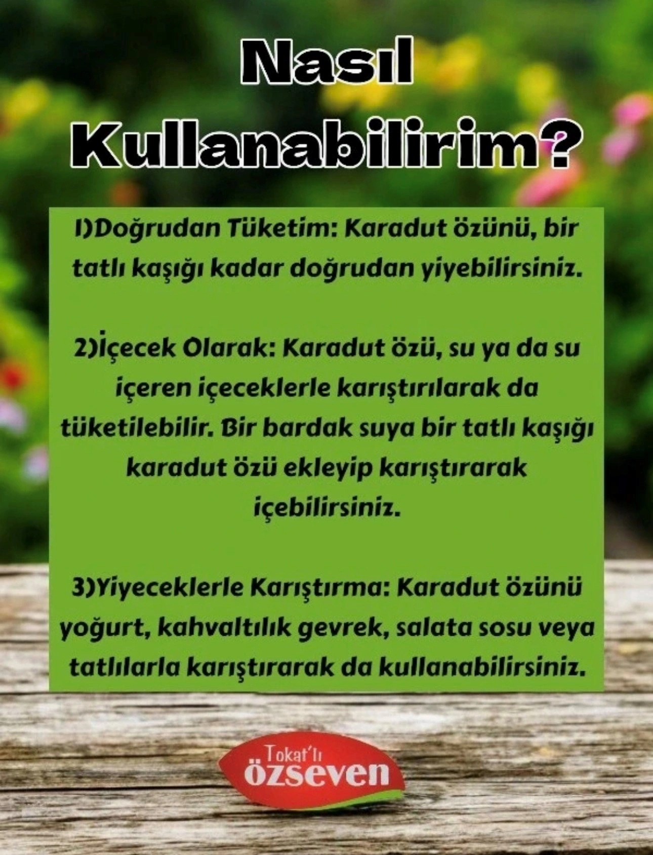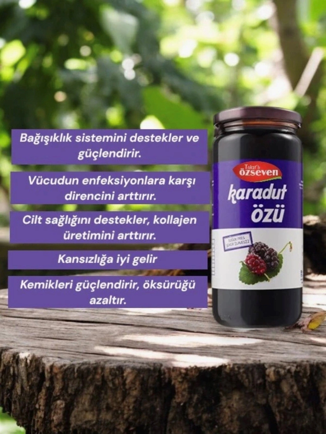 Özseven Gıda Karadut Özü, özenle seçilen karadut meyvelerinden geleneksel yöntemlere uygun şekilde üretilmiştir.; Yoğun aroması ve doğal lezzetiyle kahvaltılarda, içeceklerde ve tatlı tariflerinde güvenle tercih edilebilir.; Ürün Özellikleri • Net Miktar: 300 g • İçindekiler: Karadut özü • Katkı maddesi, renklendirici ve koruyucu içermez • Kıvam artırıcı ve ilave şeker bulunmaz • Geleneksel üretim anlayışıyla hazırlanmıştır Kullanım Önerisi Kahvaltılarda doğrudan tüketilebilir, süt, yoğurt veya su ile karıştırılarak içecek olarak hazırlanabilir.; Tatlı ve sos tariflerine doğal aroma katmak için uygundur.; Saklama Koşulları Serin, kuru ve güneş ışığından uzak yerde muhafaza ediniz.; Açıldıktan sonra kapağı kapalı şekilde buzdolabında saklanması tavsiye edilir.; Menşei Türkiye Not Doğal yapısı gereği zamanla tortu oluşabilir, bu durum ürünün doğallığının göstergesidir.