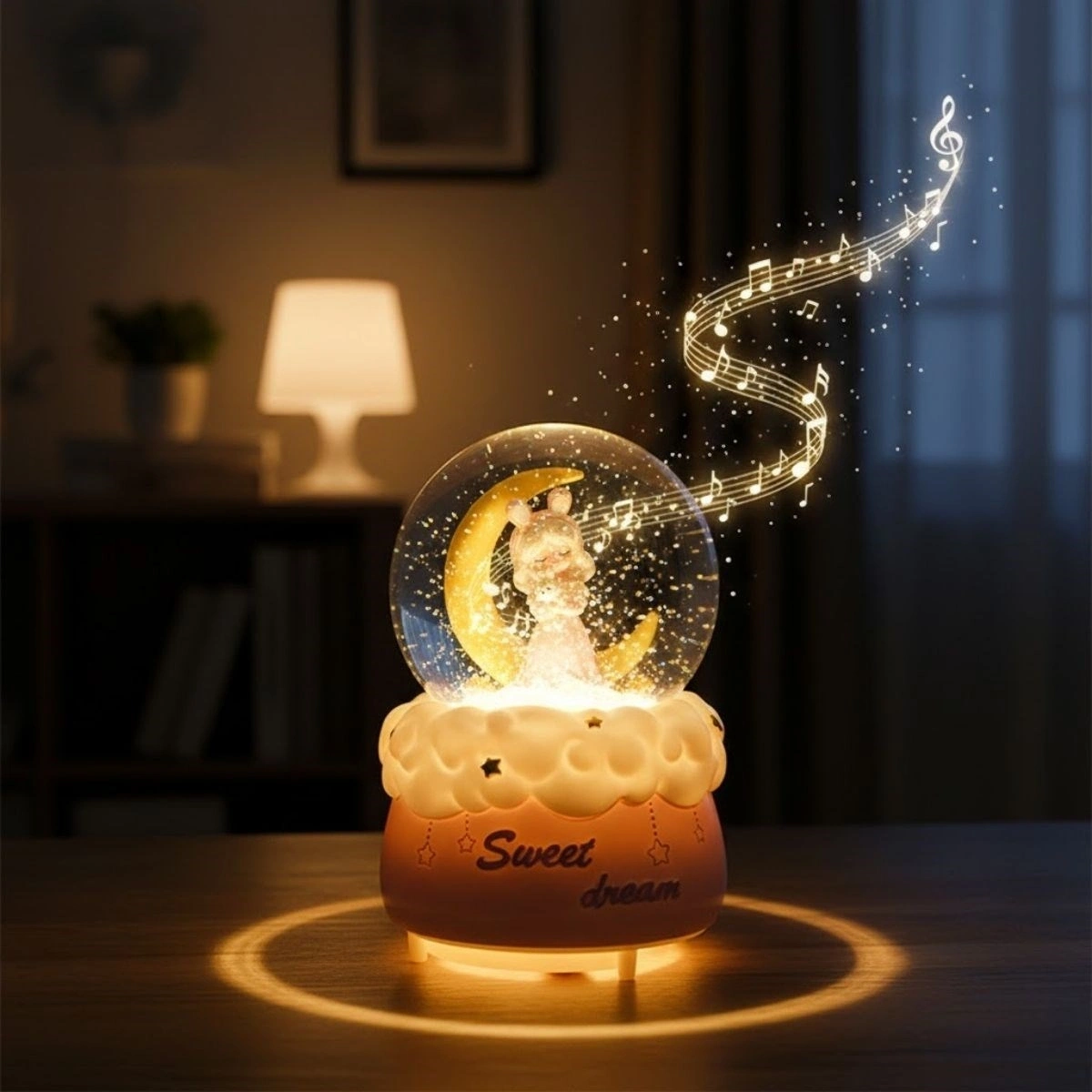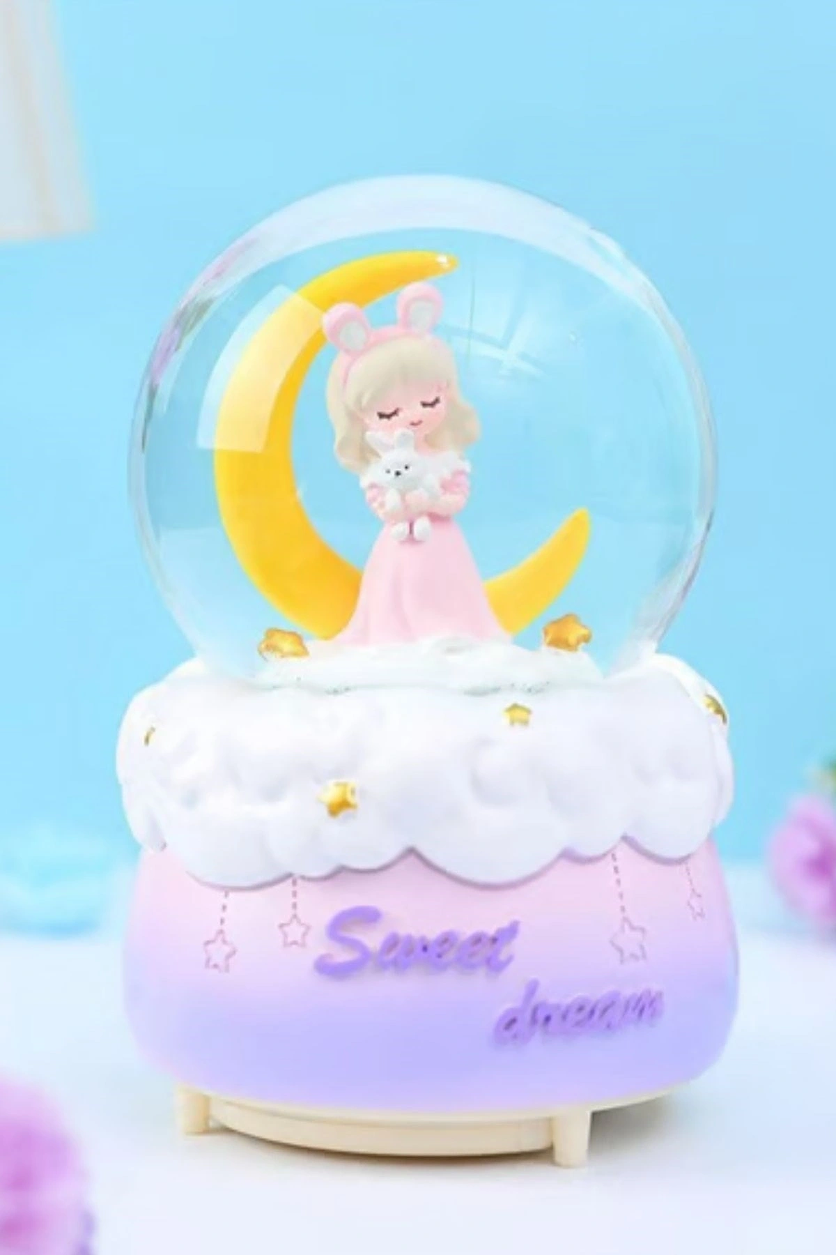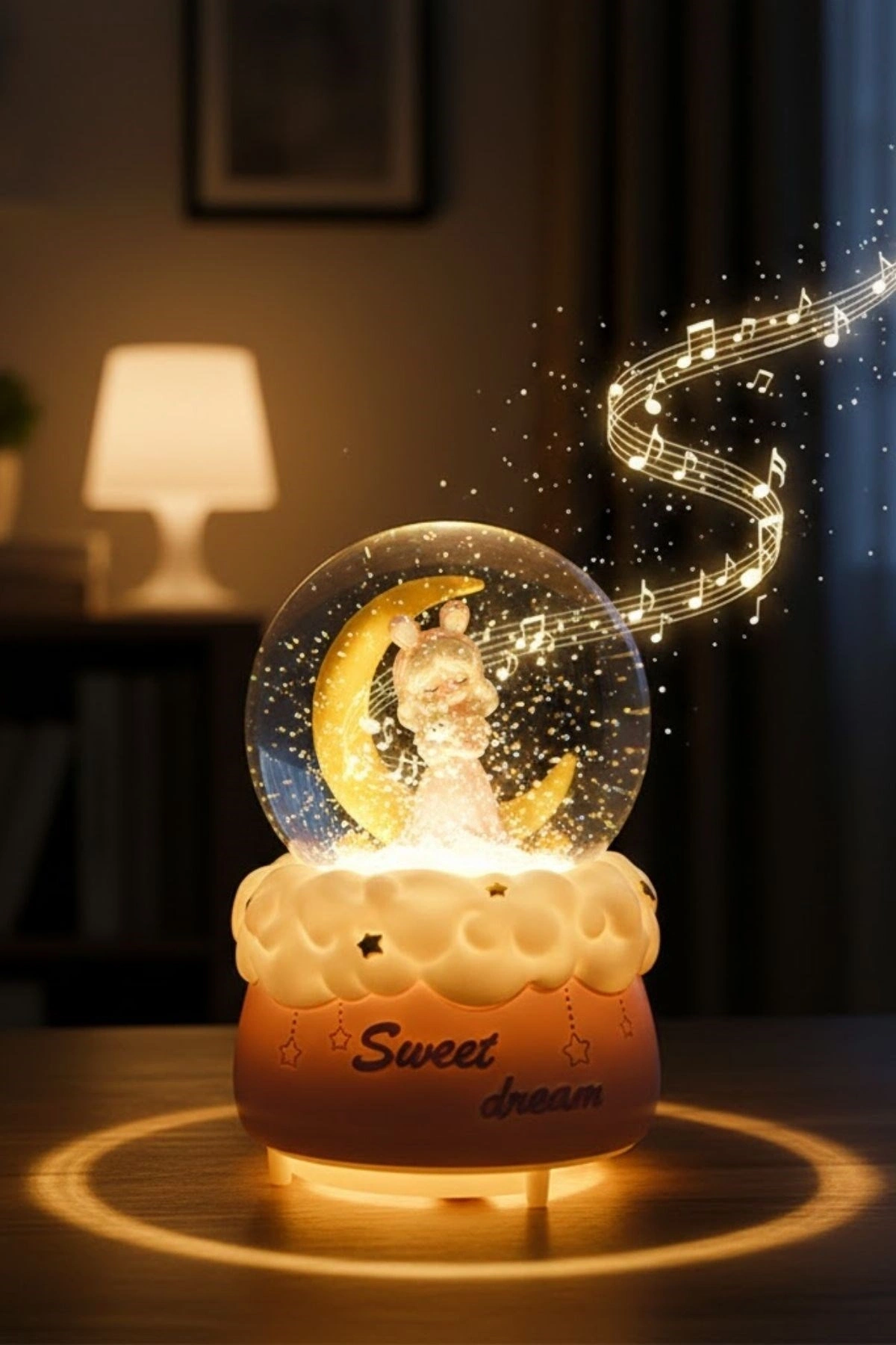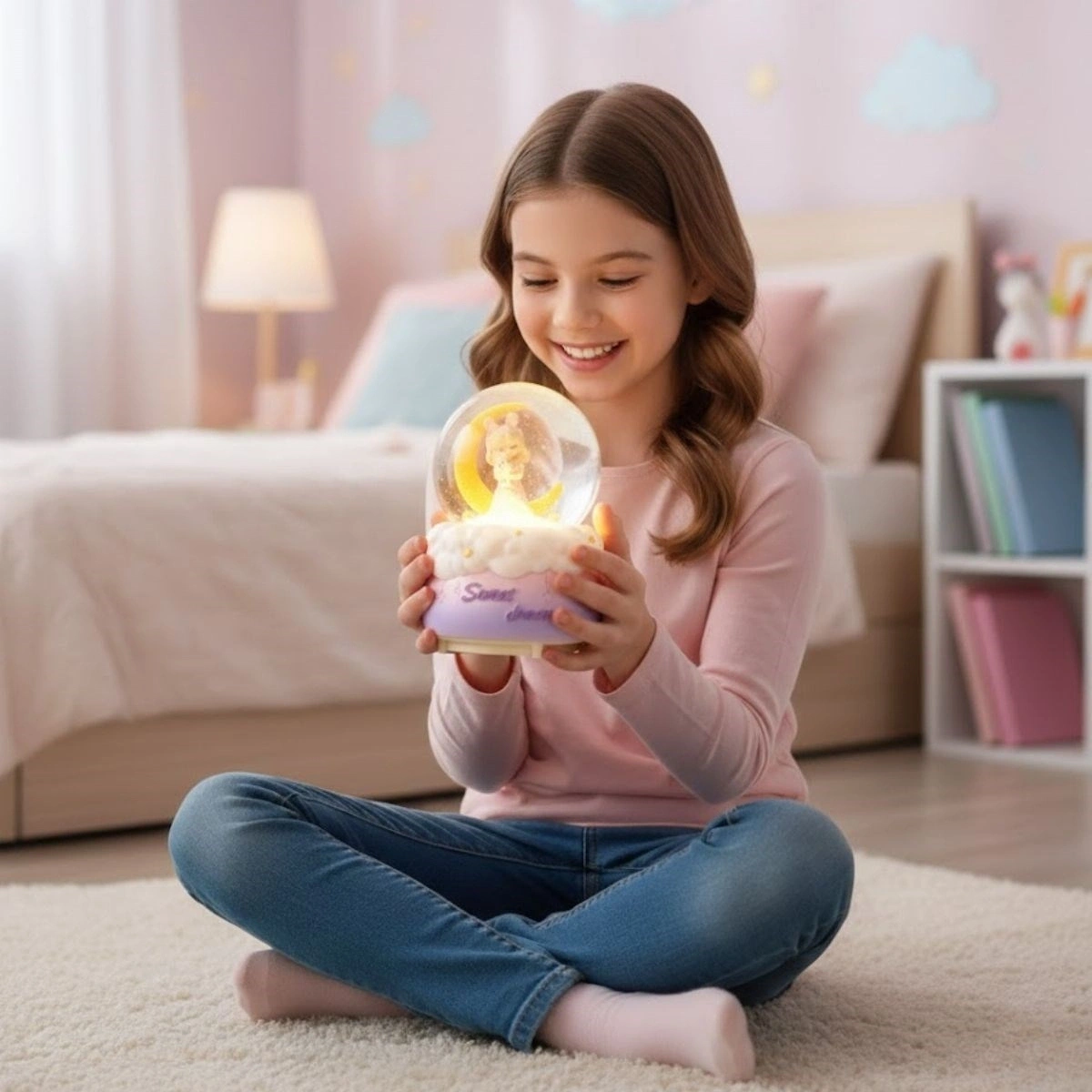 Pilli Işıklı Müzikli Kar Küresi–Hilal Ay Önünde Prenses Figürlü Eğlenceli Masaüstü Biblo, LED Aydınlatmalı Dekoratif Hediyelik Kar Küresi