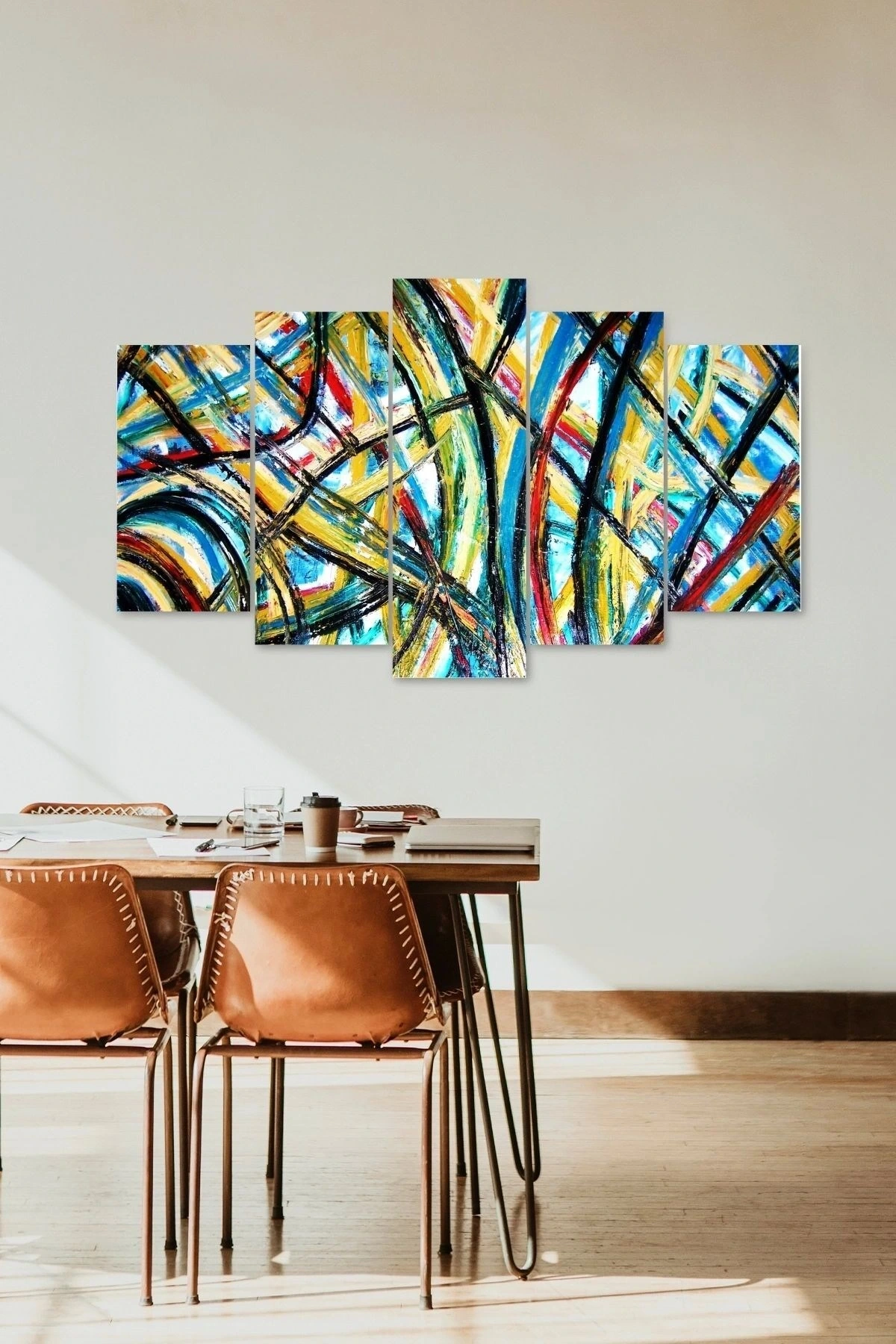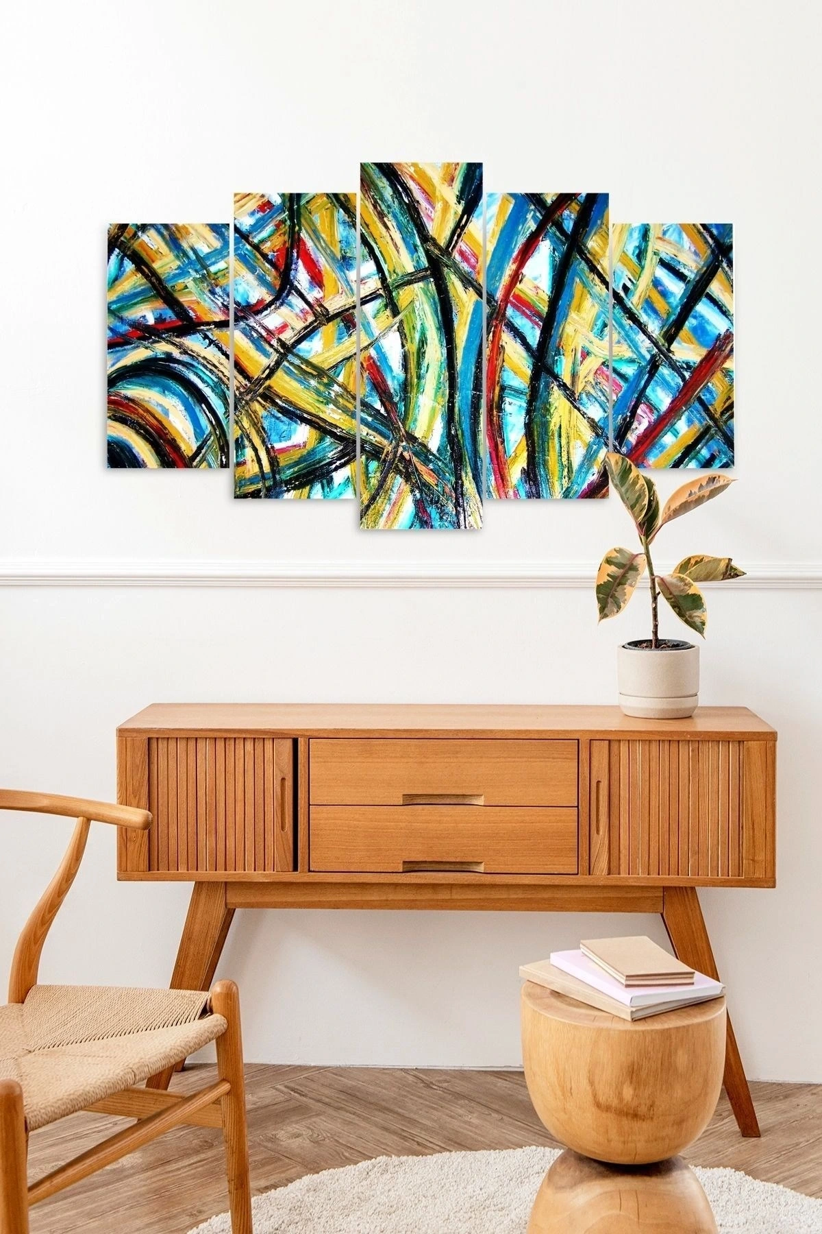 Modern dekorasyonun vazgeçilmez bir parçası olan Retro çizgiler 5 parçalı MDF tablo, evinizin atmosferini zenginleştirir; Dayanıklı ahşap malzemesiyle uzun ömürlü kullanım sunar ve modern tasarımıyla mekanınıza şıklık katar; Her bir parçada farklı bir Retro çizgi deseni bulunan bu tablo, duvarlarınıza dinamik bir dokunuş ekler;