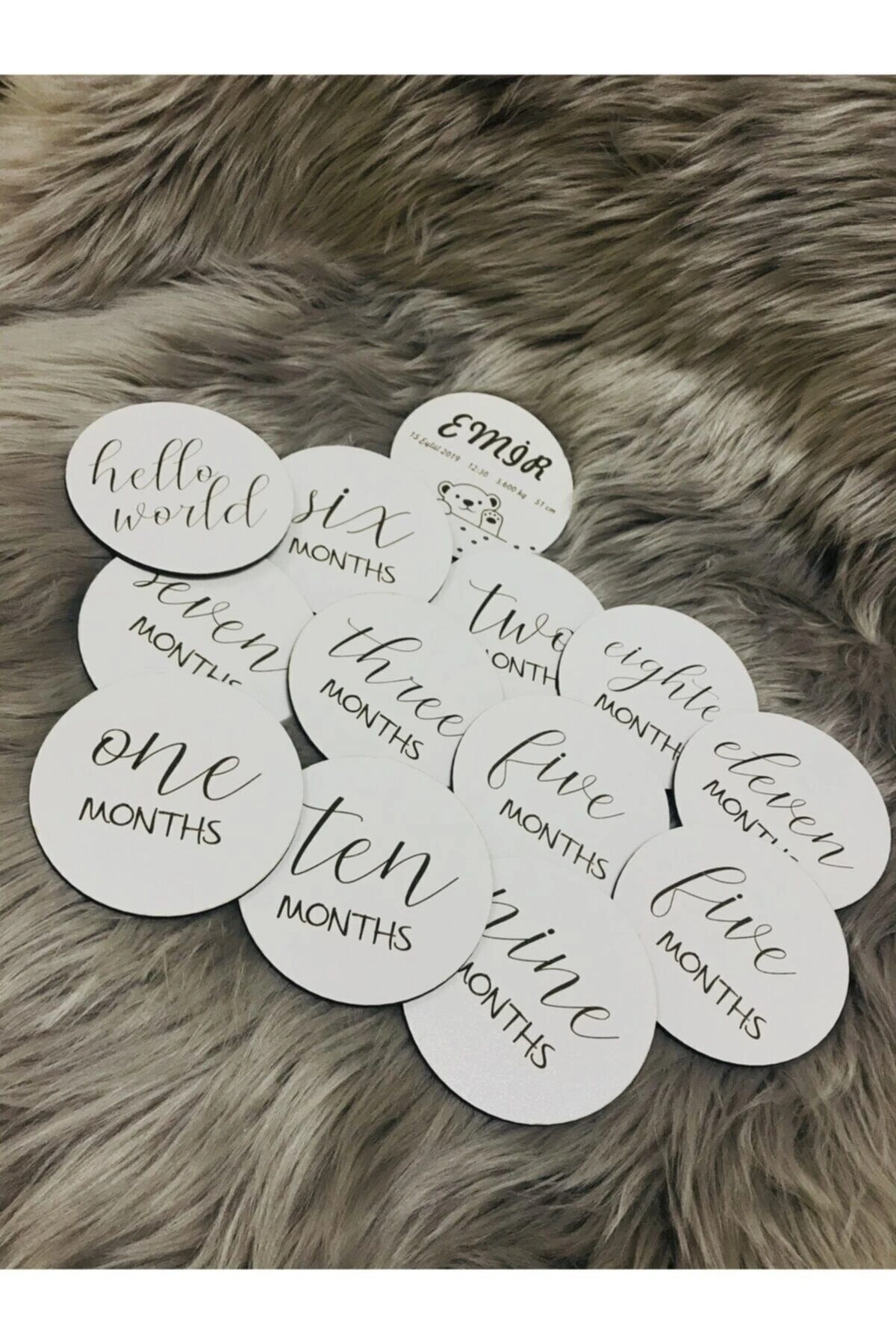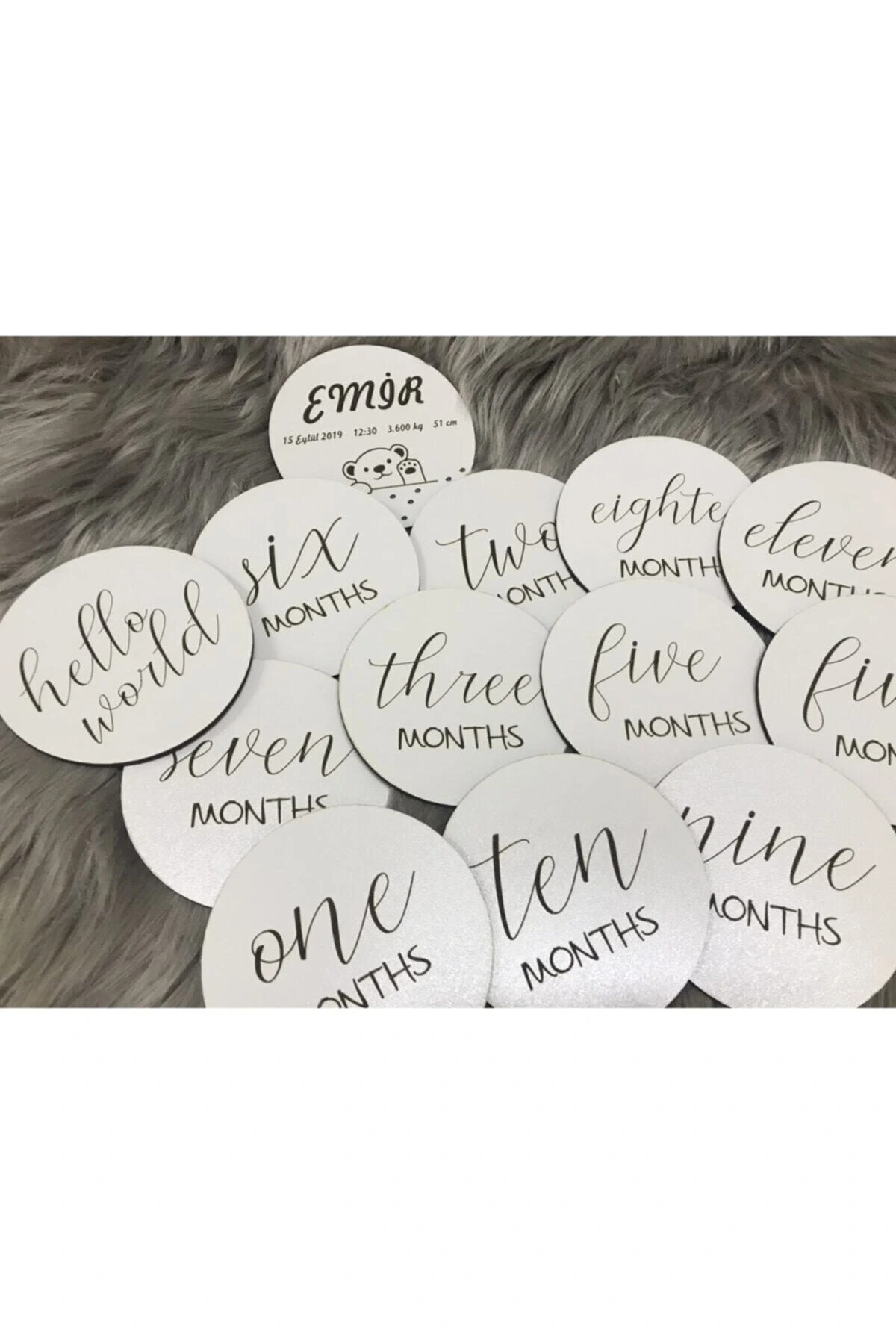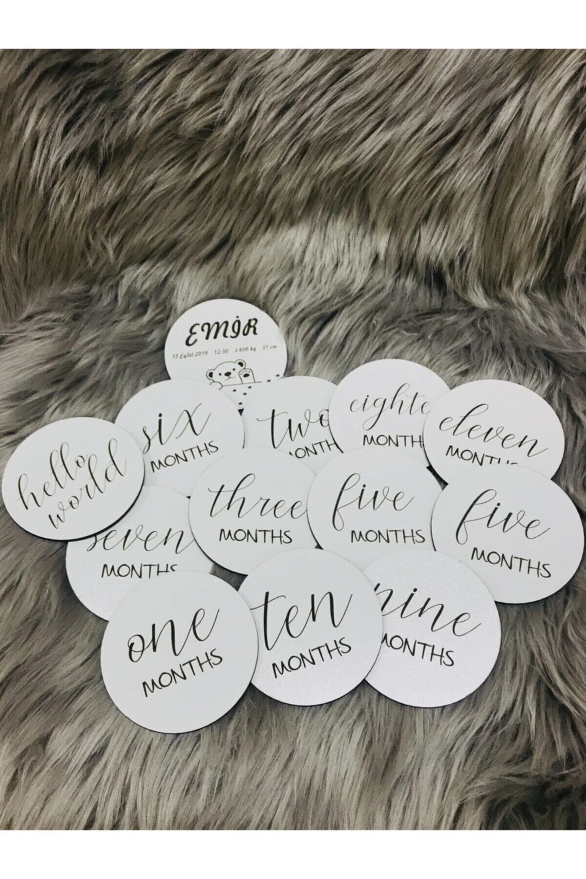 Ürün içerinde 10 cm çapında ve 3 mm kalınlığında 13 adet ahşap kart bulunmaktadır. ; Ürün içeriğindeki ahşap kartlar ile bebeğinizin doğumundan 1 yaşına kadar tüm ayları fotoğraflayabilirsiniz. ; Ürünlerin genel temizliği yapılmaktadır. ; Ürünü uzun süre zarar görmeden kullanabilir, nemli bezle temizliğini yapabilirsiniz. ; Ürünümüzle, bebeğinizle geçirdiğiniz en güzel anları ölümsüzleştirebilirsiniz. ; Aynı zamanda bir yeni doğan hediyesi olarak da oldukça ideal bir üründür. ; Ürün üzerinde kişiselleştirilebilir alan olarak yalnızca isim bulunmaktadır. ; Ürünün üzerine yazılmasını istediğiniz ismi sipariş numaranız ile birlikte mesaj olarak bize iletebilirsiniz. ; 1 gün içerisinde ürüne yazılacak ismi göndermediğiniz takdirde ürün standart yazı ile gönderilecektir.;