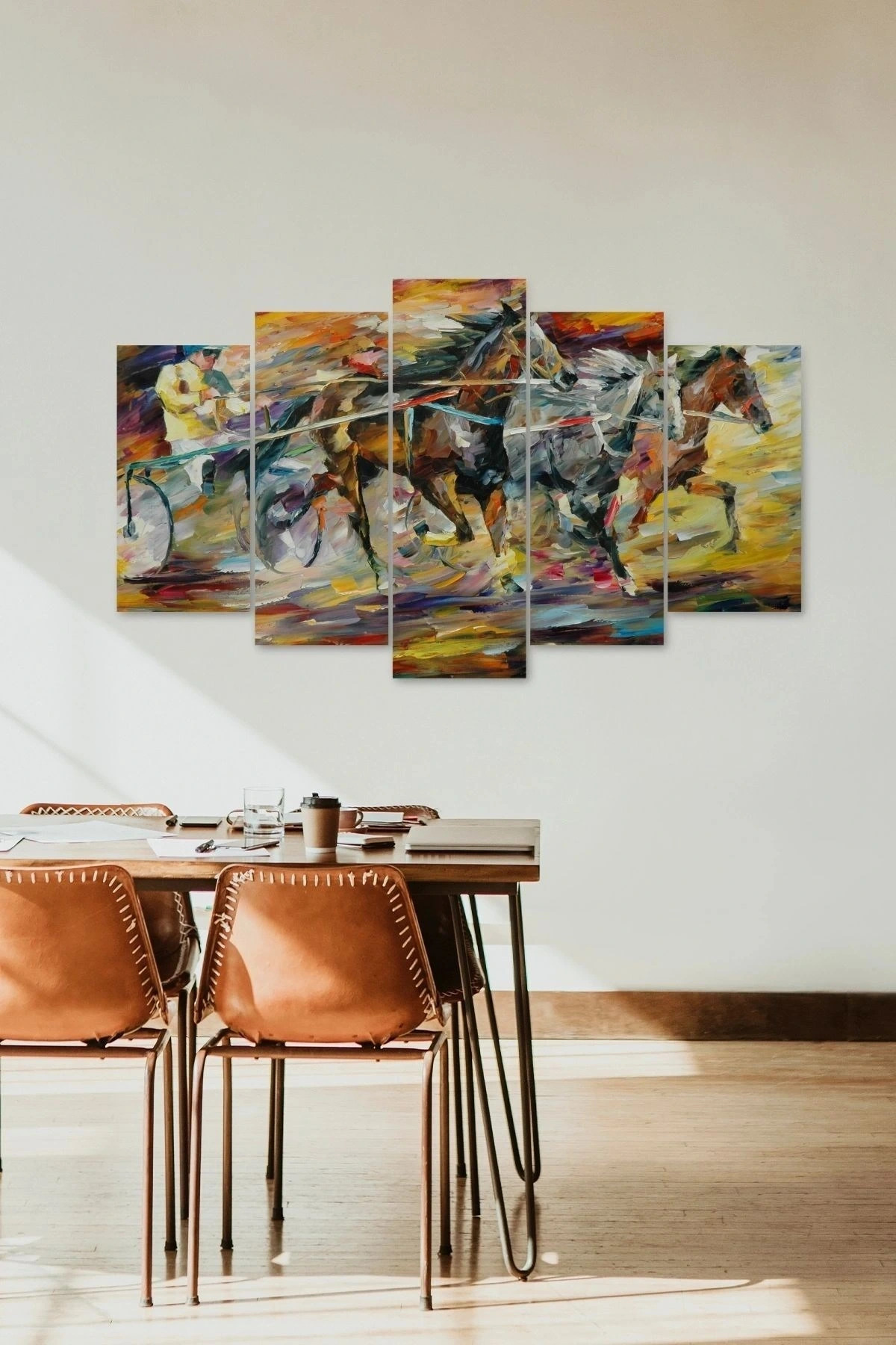 Modern tasarımıyla ev ve ofis dekorasyonunuza şıklık katan Atlar ve Arabacı 5 parçalı MDF tablo, estetik görünümüyle dikkat çeker; Dayanıklı ahşap malzemesi sayesinde uzun ömürlü kullanım sunar ve mekanınıza doğal bir dokunuş ekler; 5 parçadan oluşan set, farklı boyutlardaki parçalarla dekoratif bir bütünlük sağlar ve duvarlarınıza derinlik katar;