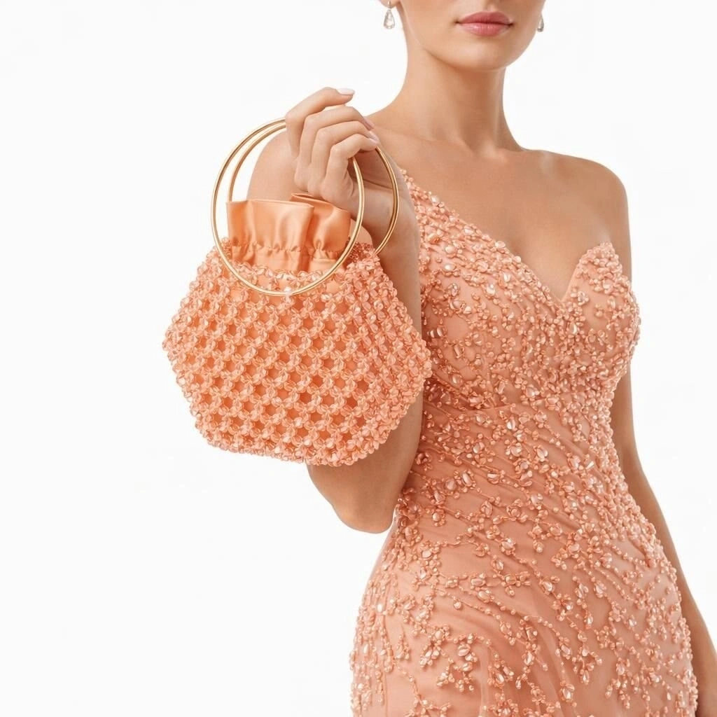 Kristal boncuklar, yüksek dayanımlı misina ile tek tek örülerek çok katmanlı bir yüzey yapısı oluşturur. Bu yapı, çantanın form bütünlüğünü korurken kristal örgünün üç boyutlu etkisini güçlendirir ve yapısal stabilite sağlar.