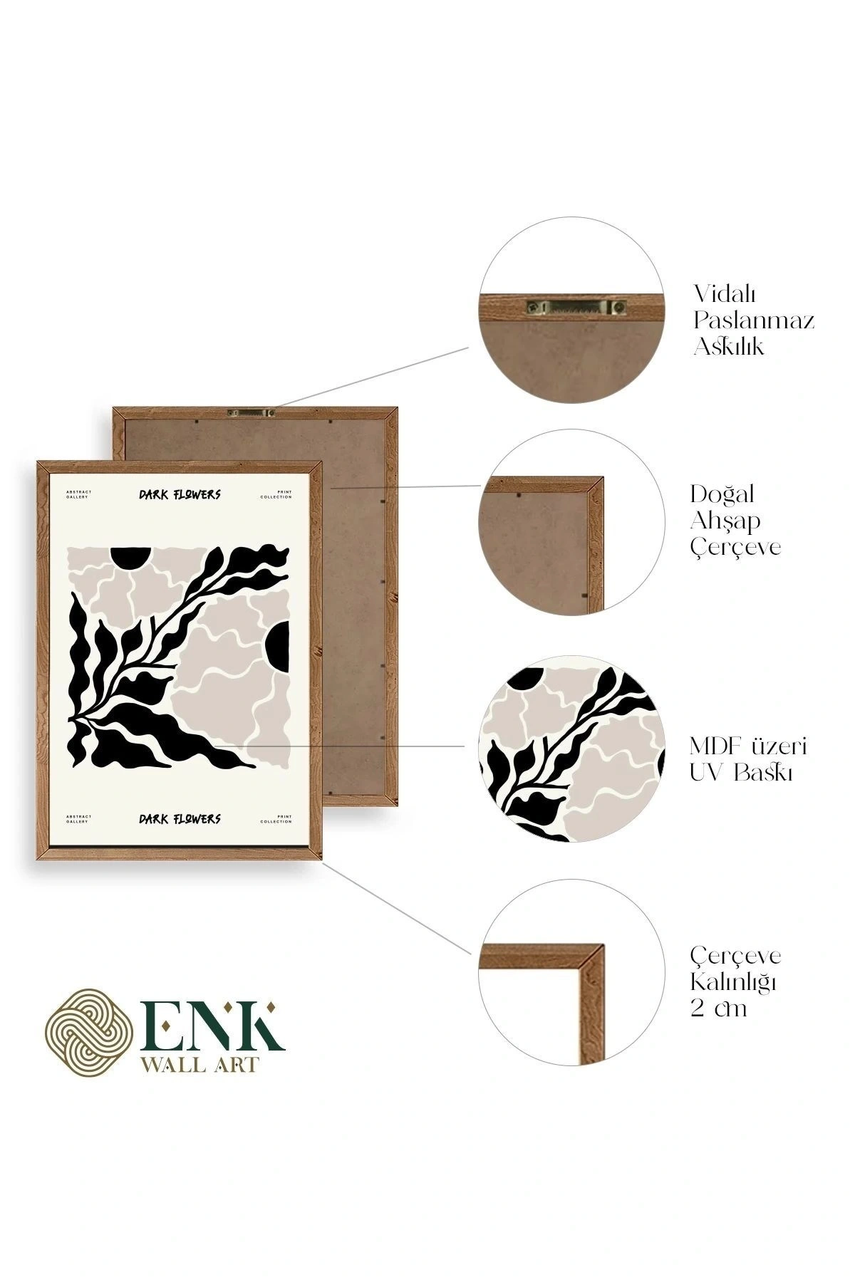 Tablolarımız gerçek ahşap çerçevelidir, çerçeve görünümlü değildir. ; ENK Wall Art Olarak Ahşap Çerçeveli Tablolar Üretiyoruz. ; Tablolarımız tek parça, 3 Parça, 5 Parça ve daha çok kategoride tasarımcılarımız tarafından ev ve ofisleriniz duvarları süslemek için tasarlanmaktadır. ; Ahşap Çerçeveli Duvar Tabloları ile yaşam alanlarınıza yepyeni bir görünüm kazandırın. ; Yıllarca dayanacağından emin olduğumuz sağlam çerçevelere sahip yüksek kaliteli ahşaptan üretilmiştir. ; İster bir köşeyi süslemek isteyin, ister evinizi yenilemek , bu ahşap tablolar herhangi bir yaşam alanına stil ve işlev getirecektir. ; Duvara kolay bir şekilde monte edilir. ; Uzun ömürlü kullanım için sağlam ahşap çerçeveden yapılmış, dayanıklı ve güçlü. ; Duvara monte edilebilir tasarımı, yaşam alanlarında veya yatak odalarında duvara kolayca asılmasını sağlar. ; Pürüzsüz üst yüzeyi temiz kalmayı kolaylaştırır. ; Herhangi bir stile uyacak şekilde çeşitli renklerde gelir. ; Kolay yeniden düzenleme için hafif ve portatif. ; Küçük oturma odaları veya dar alanlar için mükemmel boyut. ; Eve taşınma hediyesi olarak idealdir. ; Herhangi bir evin dekorunu süslemek için harika bir yol. ; Herhangi bir modern veya çağdaş iç tasarıma mükemmel bir katkı. ; Tablo içi 3 mm mdf (ahşap) malzeme üzeri uv baskıdır. ; Renkler canlı ve solma yapmaz. ; Kırılma, bükülme ve çizilmeye karşı dayanıklıdır.;