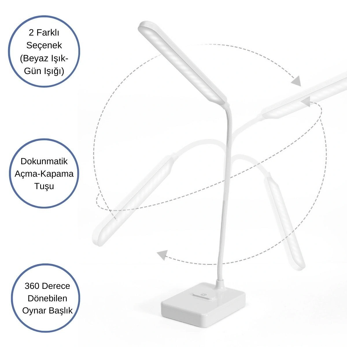 360 Derece Dönebilen Lamba isteğinize göre bükülebilir Daha geniş bir aydınlatma aralığı ve daha rahat bir aydınlatma deneyimi elde etmek için masa lambasını uygun bir yüksekliğe ve açıya ayarlayabilirsiniz
