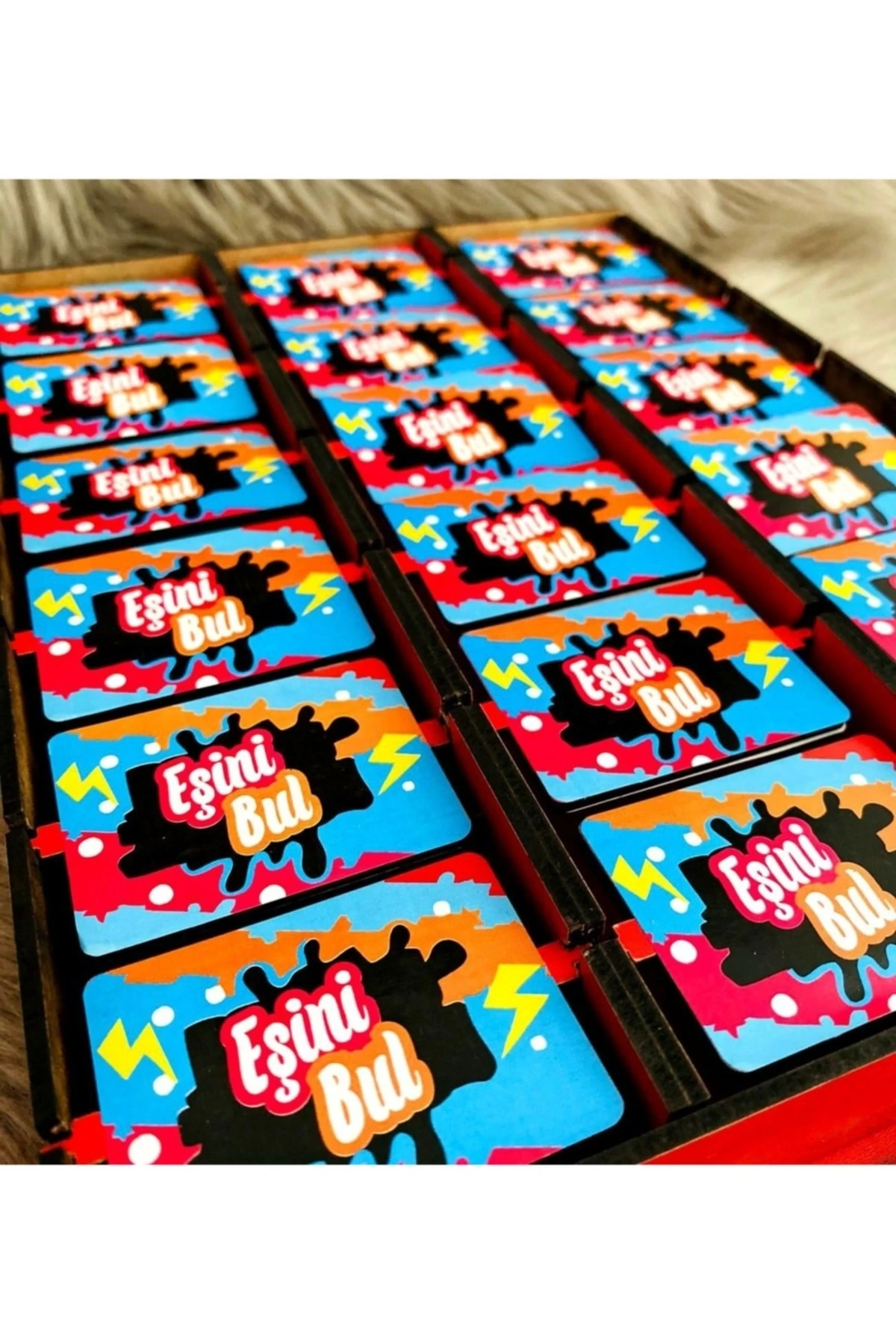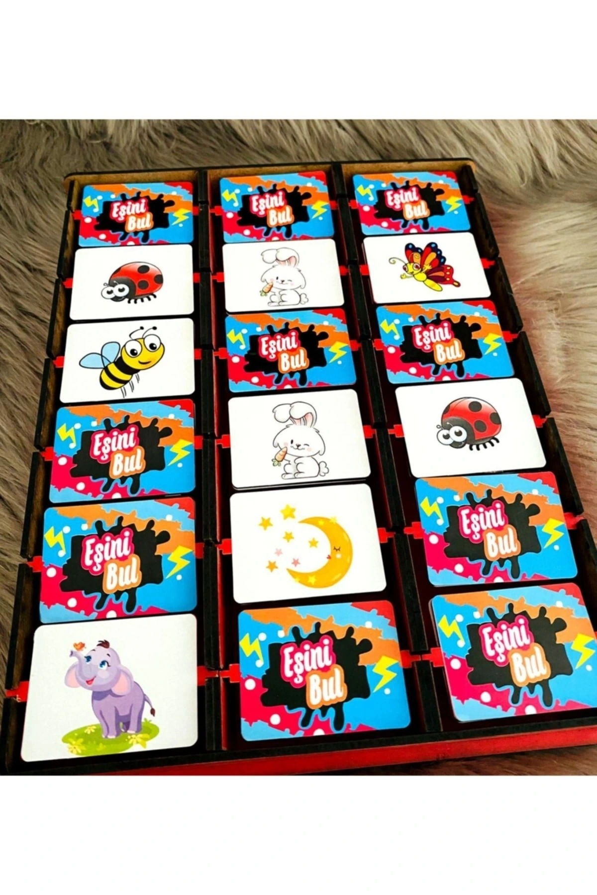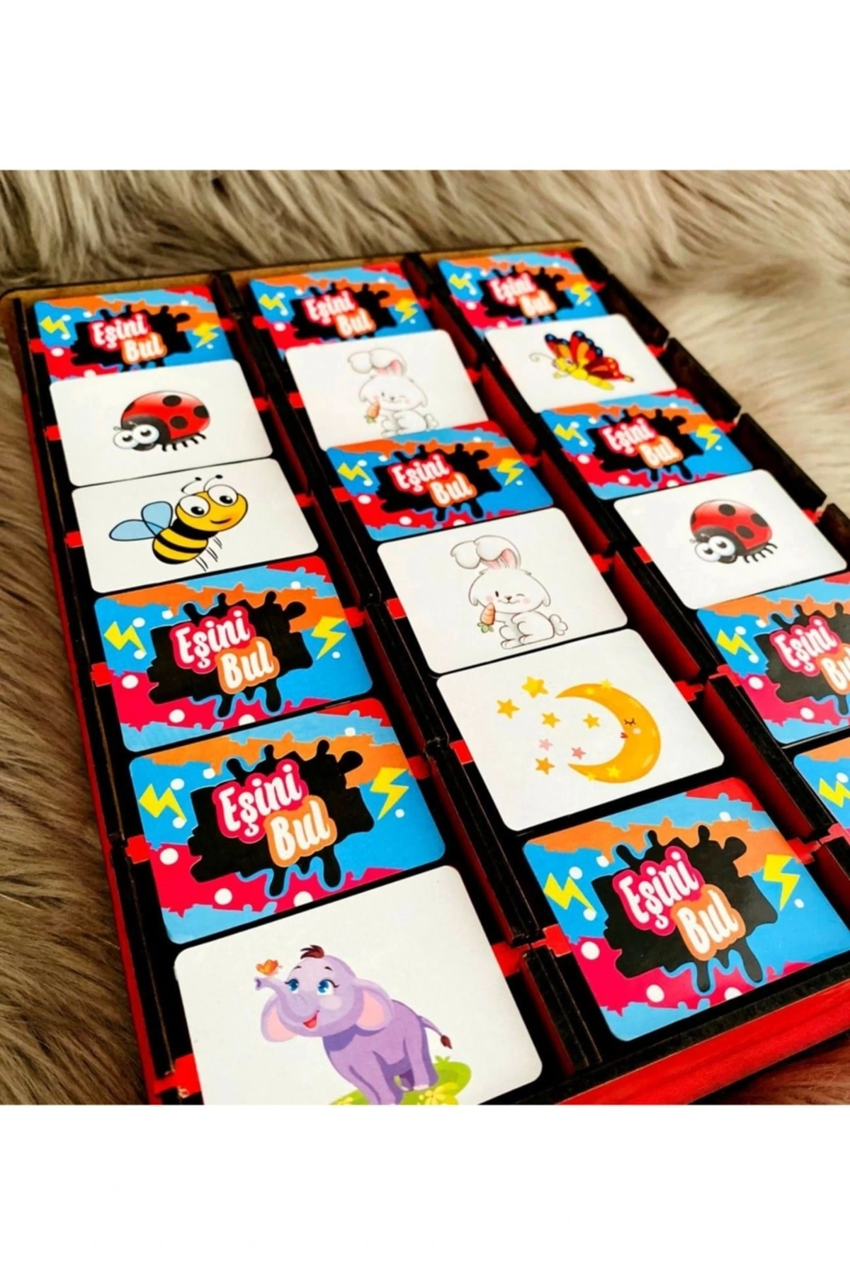*3 mm ahşap mdf'den üretilmektedir. ; *30x23 cm 'dir. ; *Fotoğraf kısımlarının her biri 4,5x6 cm 'dir. ; *Oyun 2 kişi ile oynanır. ; Oyun içerisinde 9 adet eşleşme bulunur. ; Oyun hazırlığı yapılırken, sembol parçaları ters çevrilerek karıştırılır. ; Platform üzerine ters şekilde dizilir. ; Oyun başlangıcında ilk seçim hakkı sıra ile belirlenir. ; Seçim sonrası eşleşme bulunamaz ise seçim sırası diğer oyuncuya geçer. ; Eşleşme bulan oyuncu seçim yapmaya devam eder. ; 5 eşleşme bulan turu kazanır. ; Toplamda 5 tur kazanan oyunun galibi olur.;