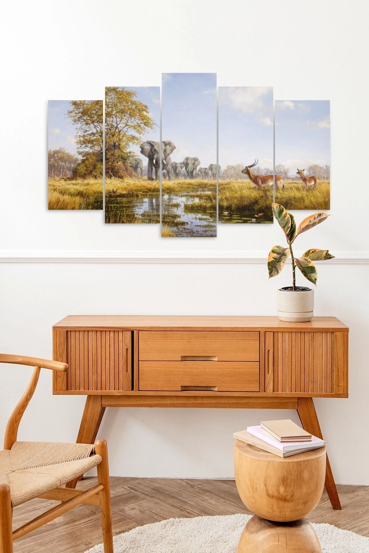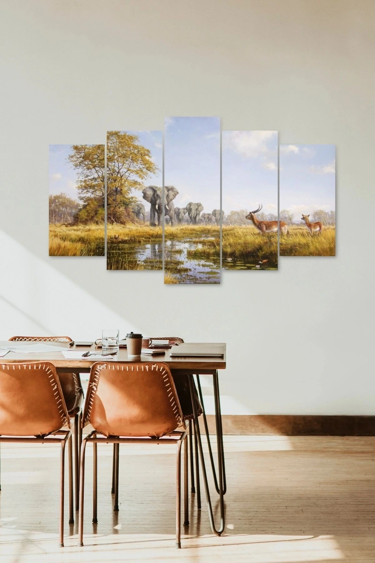 Modern dekorasyonun vazgeçilmez bir parçası olan bu 5 parçalı MDF tablo, evinizin veya ofisinizin atmosferini zenginleştirir; Ahşap malzemesiyle doğal bir dokunuş sunan bu tablo, dayanıklılığı ve uzun ömürlü kullanımı ile ön plana çıkar; Filler ve geyiklerin zarif tasarımları, doğanın güzelliklerini evinize taşırken, modern stil sahibi bir görünüm sağlar;