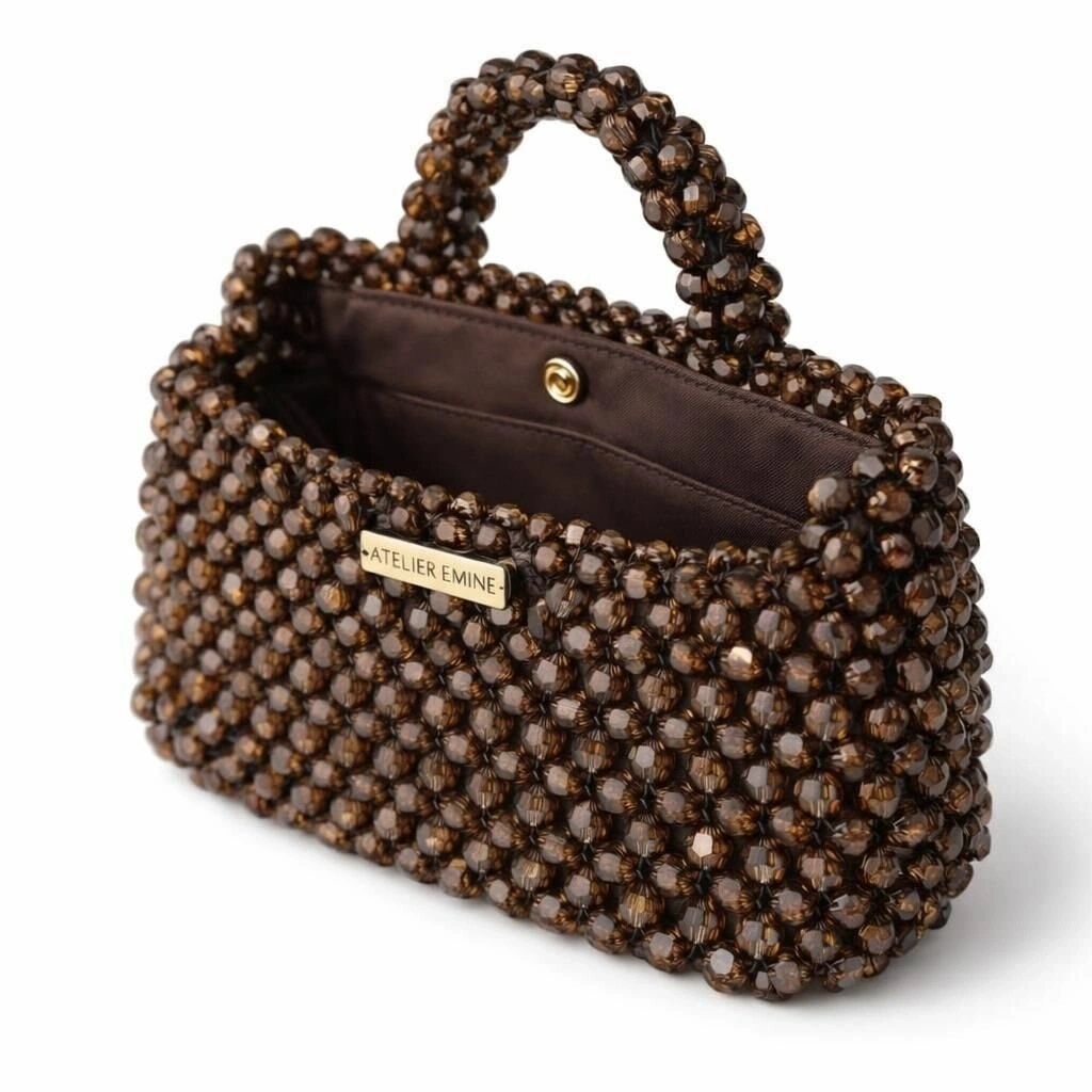 Atelier Emine’in Crystal Gelato Couture koleksiyonuna ait Fresco Corteza, 8 mm standart yuvarlak kesim optik sınıfı kristal boncukların yüksek mukavemetli misina ile örülmesiyle tamamen el işçiliğiyle üretilmiş, yapısal formu ve mücevher etkili yüzeyiyle öne çıkan bir top-handle mini çanta modelidir.