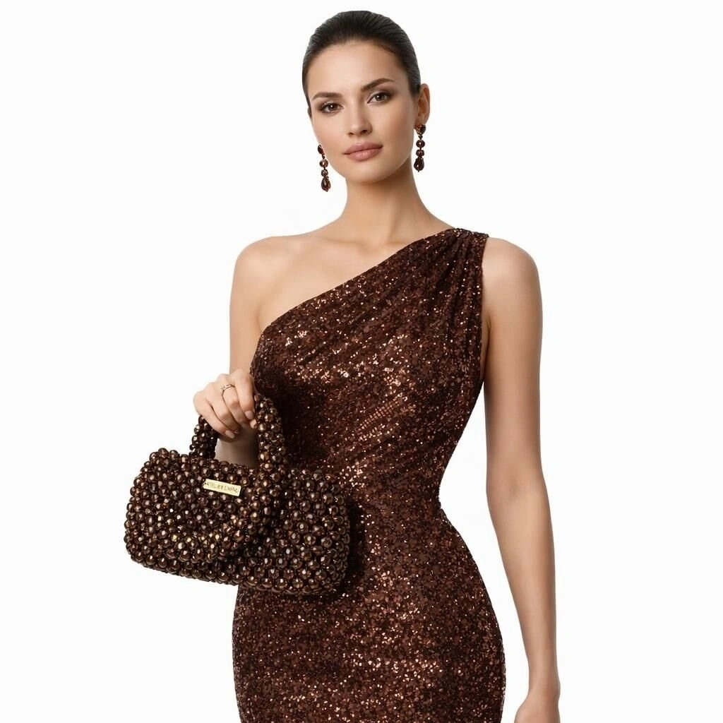 Kristal boncuklar, yüzeyde maksimum ışık kırılımı ve derinlik etkisi elde edilecek şekilde yoğun, modüler ve çok katmanlı bir örgü sistemi ile tek tek işlenmiştir. Gövde, keskin köşelerden arındırılmış ancak net hatlarla tanımlanmış dikdörtgen siluetiyle güçlü bir hacim dengesi sunar.