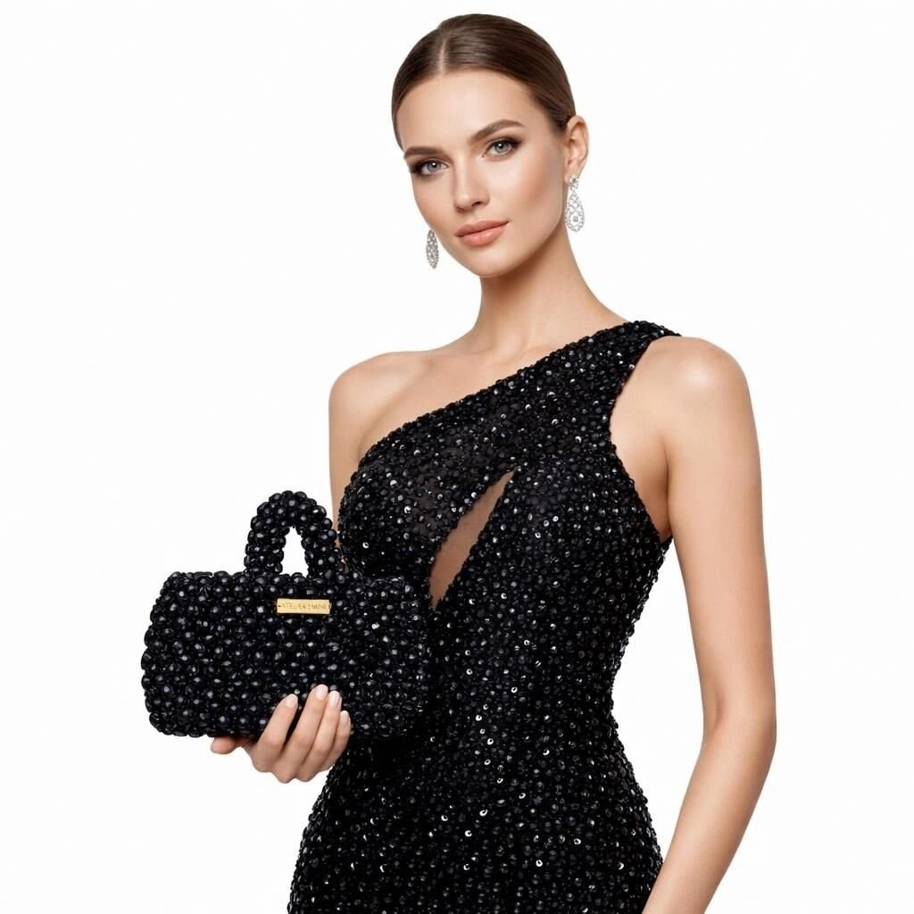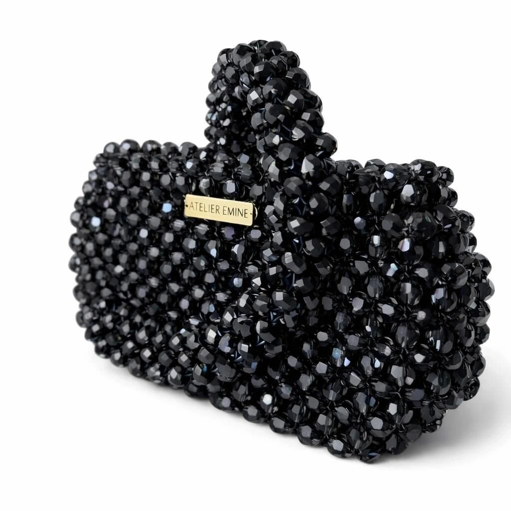 Atelier Emine’in Crystal Gelato Couture koleksiyonuna ait Fresco Tenebra, 8 mm standart yuvarlak kesim optik sınıfı kristal boncukların yüksek mukavemetli misina ile örülmesiyle tamamen el işçiliğiyle üretilmiş, yapısal formu ve mücevher etkili yüzeyiyle öne çıkan bir top-handle mini çanta modelidir.