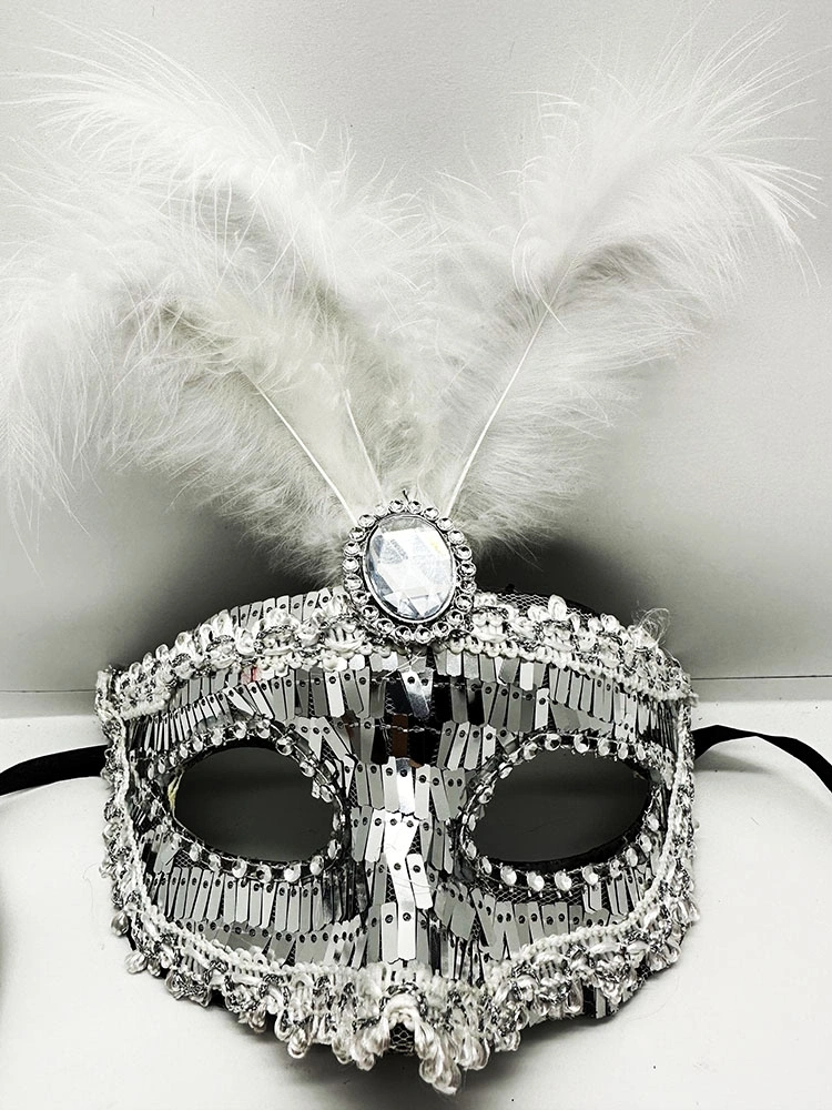 Gümüş Renk Payetli Pullu Tüylü Parti Maskesi