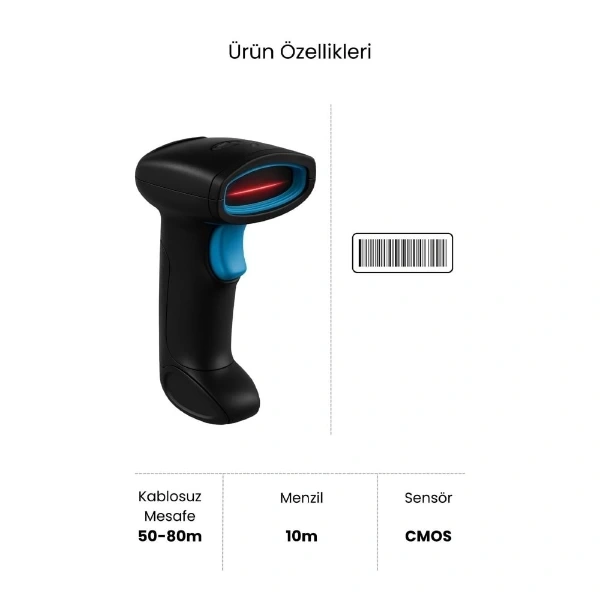 KABLOSUZ 1D/2D STANDLI BARKOD & KAREKOD OKUYUCUÜrün ÖzellikleriProfesyonel iş akışlarını hızlandırmak için tasarlanan Kablosuz 1D/2D Standlı Barkod & Karekod Okuyucu, yüksek performanslı CMOS kamera modülü sayesinde hem 1D hem de 2D barkodları hızlı ve hassas bir şekilde tarar. Wireless bağlantı teknolojisi ile dış mekanda 100 metreye, iç mekanda ise 30 metreye kadar kesintisiz okuma mesafesi sunar. Gelişmiş Wi-Fi bağlantı gücü, veri aktarımında maksimum stabilite sağlar.USB tak-çalıştır özelliği sayesinde ek bir yazılım kurulumu gerektirmeden anında kullanılabilir. Ergonomik tasarımı ve sağlam standı ile masaüstü kullanımda büyük kolaylık sağlar. Hafızalı parametre ayarları sayesinde kişisel tarama tercihlerinizi kaydeder ve envanter yönetimi süreçlerini kolaylaştırır.Windows, Mac ve Linux işletim sistemleriyle tam uyumlu çalışan bu cihaz, Word, Excel, Novell gibi yaygın yazılımlarla entegre şekilde çalışır. Yüksek okuma hassasiyeti sayesinde hem basılı barkodları hem de ekran üzerindeki karekodları zahmetsizce algılar. Uzun ömürlü bataryası sayesinde gün boyu kesintisiz performans sağlar.Depolama alanlarından marketlere, ofislerden lojistik merkezlerine kadar birçok farklı kullanım alanı için ideal bir çözümdür.Paket İçeriği1 adet kablosuz barkod okuyucu1 adet masaüstü stand1 adet USB alıcı