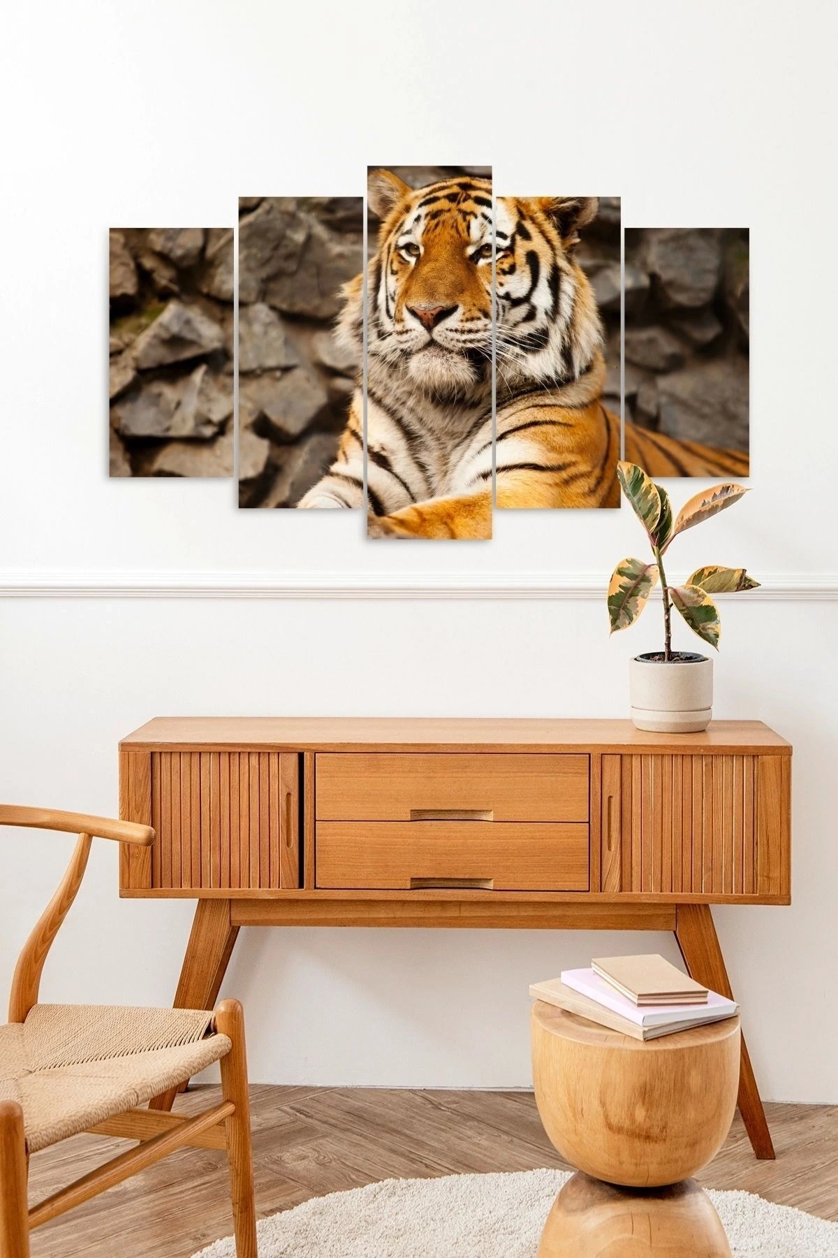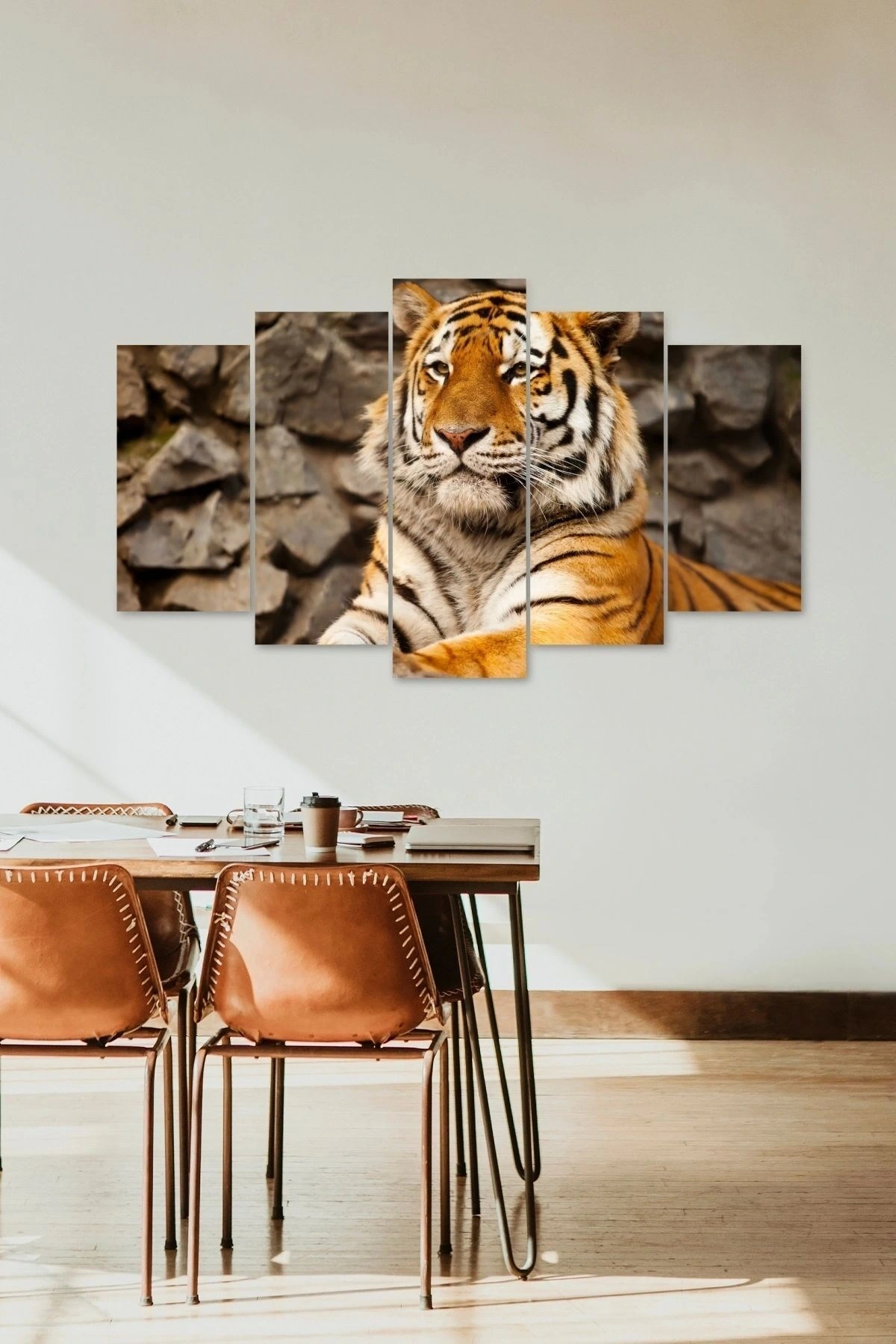 Modern dekorasyonun vazgeçilmez bir parçası olan bu kaplan portresi, evinizin veya ofisinizin atmosferini zenginleştirir; Yüksek kaliteli MDF malzemeden üretilmiş olup, uzun ömürlü ve dayanıklı kullanım sunar; Kaplanın asil ve güçlü duruşunu yansıtan bu 5 parçalı tablo, mekanınıza derinlik katar;