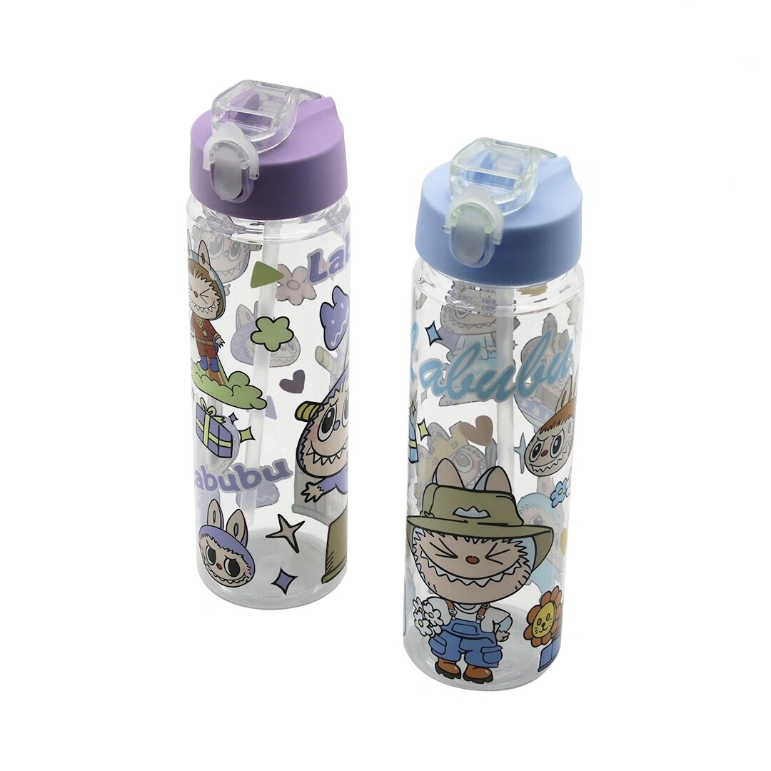 LABUBU ÇOCUK ÇİZGİ FİLM KARAKTER RESİMLİ SU MATARASI ŞEFFAF PLASTİK PİPETLİ KİLİTLİ KAPAK (5365)