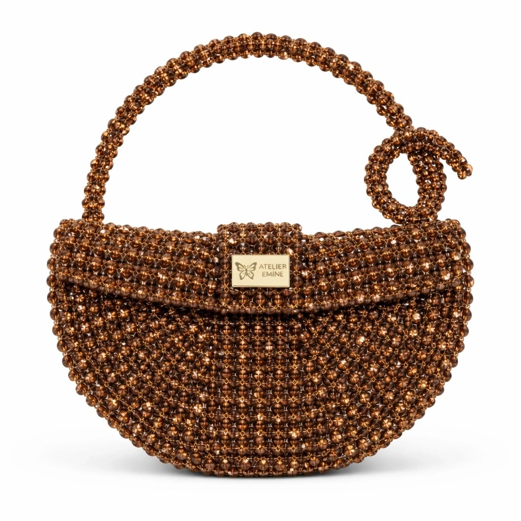 Atelier Emine’in Crystal Gelato Couture serisine ait Melo Nocciola, 8 mm optik sınıfı kristal boncukların yüksek dayanımlı misina ile örülmesiyle tamamen el işçiliğiyle üretilmiş, yarım ay formunda premium mini çanta modelidir.