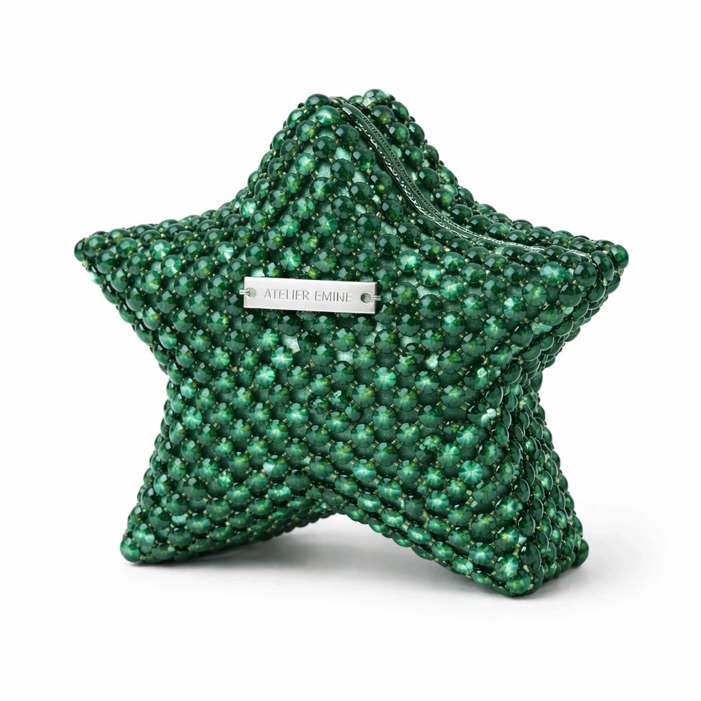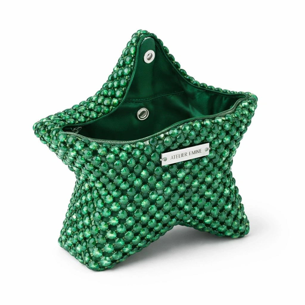 Atelier Emine’in Crystal Gelato Couture serisine ait Mielo Chloris, üç boyutlu yıldız formu esas alınarak tasarlanmış; 8 mm optik sınıfı kristal boncukların yüksek dayanımlı misina ile tek tek örülmesiyle üretilmiş, heykelsi nitelik taşıyan premium mini clutch modelidir.