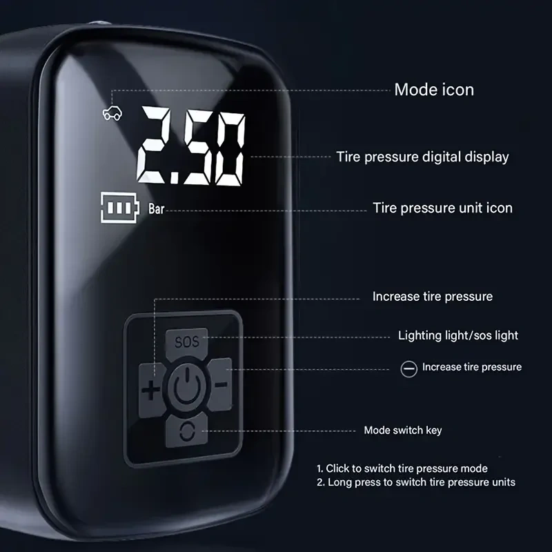 Çeşitli senaryolara uyum: Çeşitli aksesuarlarla, dört ilgili enflasyon modu ile otomobil, motosiklet, elektrikli motosiklet, bisiklet ve topları şişirebilir. 2. Gerçek zamanlı lastik basıncı göstergesi, kullanımı kolay, tek anahtar enflasyon: Lastik basıncı değeri ilk kez ayarlandıktan sonra, çipte otomatik olarak kaydedilir. Tekrar şişirirken, değeri otomatik olarak ayıklamak ve şişirmeye başlamak için başlat düğmesine basın. Lastik basıncı önceden ayarlanmıştır ve personelin denetlemesine gerek yoktur. Lastik basıncı değerine ulaşıldığında, enflasyon otomatik olarak durdurulacak ve enflasyon daha endişesiz olacaktır. 3. Herhangi bir zamanda bir güç bankasına dönüştürülebilir ve USB evrenseldir: Küçük boyutlu, cep telefonları, vb şarj etmek için taşınabilir bir güç bankası olarak kullanılabilir.