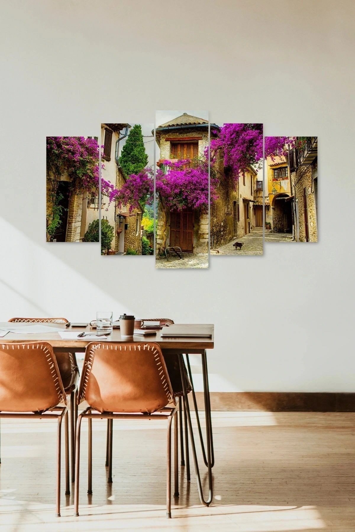 Modern tasarımıyla evinizin dekorasyonuna şıklık katan 5 parçalı MDF tablo, mekanınıza çağdaş bir hava katıyor; Dayanıklı ahşap malzemesi sayesinde uzun ömürlü kullanım sunar ve estetik görünümüyle dikkat çeker; Mor çiçek desenleriyle süslenmiş bu tablo, mekanınıza renkli ve canlı bir dokunuş ekler;