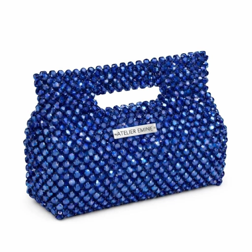 Atelier Emine’in Crystal Gelato Couture serisine ait Panna Blueberry, 8 mm optik sınıfı kristal boncukların yüksek dayanımlı misina ile tek tek örülmesiyle üretilmiş, formu gövdeyle bütünleşik top-handle yapıya sahip premium clutch modelidir.
