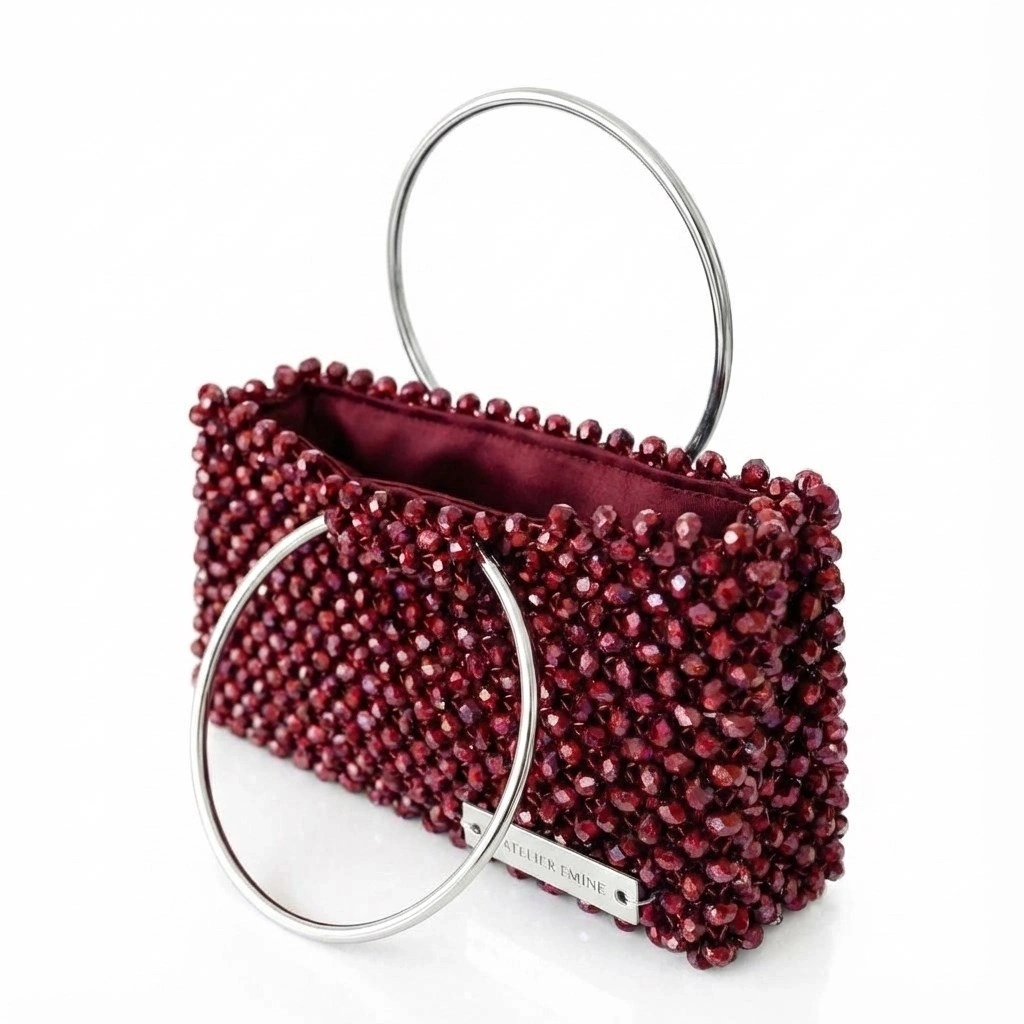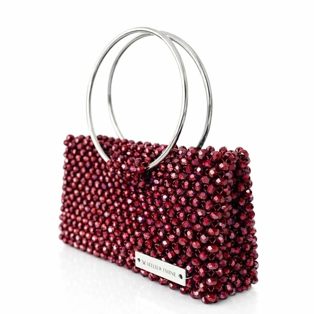 Atelier Emine’in Crystal Gelato Couture serisine ait Panna Garnet, 8 mm optik sınıfı kristal boncuklar, çift metal halka kulp ve saten astar kullanılarak tamamen el işçiliğiyle üretilmiş premium top-handle çanta modelidir.