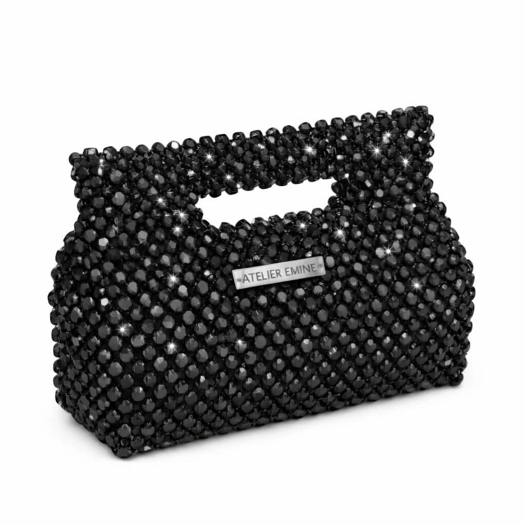 Atelier Emine’in Crystal Gelato Couture serisine ait Panna Liquorice, 8 mm optik sınıfı kristal boncukların yüksek dayanımlı misina ile tek tek örülmesiyle üretilmiş, formu gövdeyle bütünleşik top-handle yapıya sahip premium clutch modelidir.