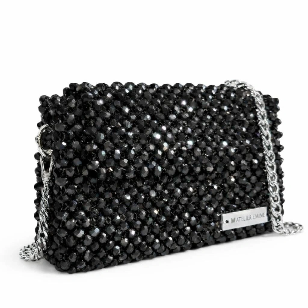 Atelier Emine’in Crystal Gelato Couture koleksiyonuna ait Panna Void, 8 mm optik sınıfı kristal boncukların yüksek dayanımlı misina ile tek tek örülmesiyle üretilmiş, dikdörtgen formlu premium mini çanta modelidir.