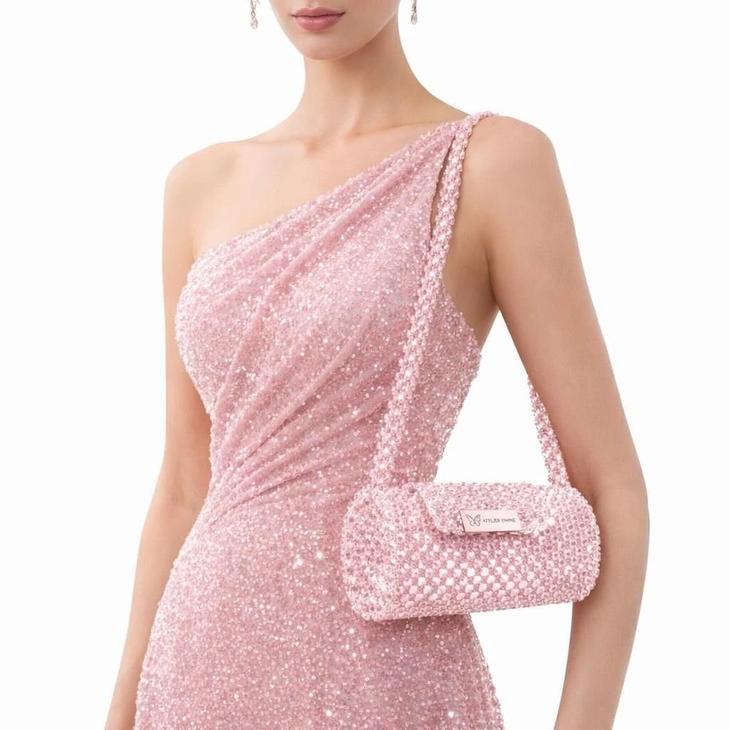Kristal boncuklar tek tek örülerek homojen bir yüzey dokusu elde edilmiş; gövde, silindirik formda yapılandırılarak kendi kendini taşıyabilen dengeli bir strüktür oluşturulmuştur. Kristal örgü yoğunluğu, çantanın form bütünlüğünü ve estetik sürekliliğini destekler.