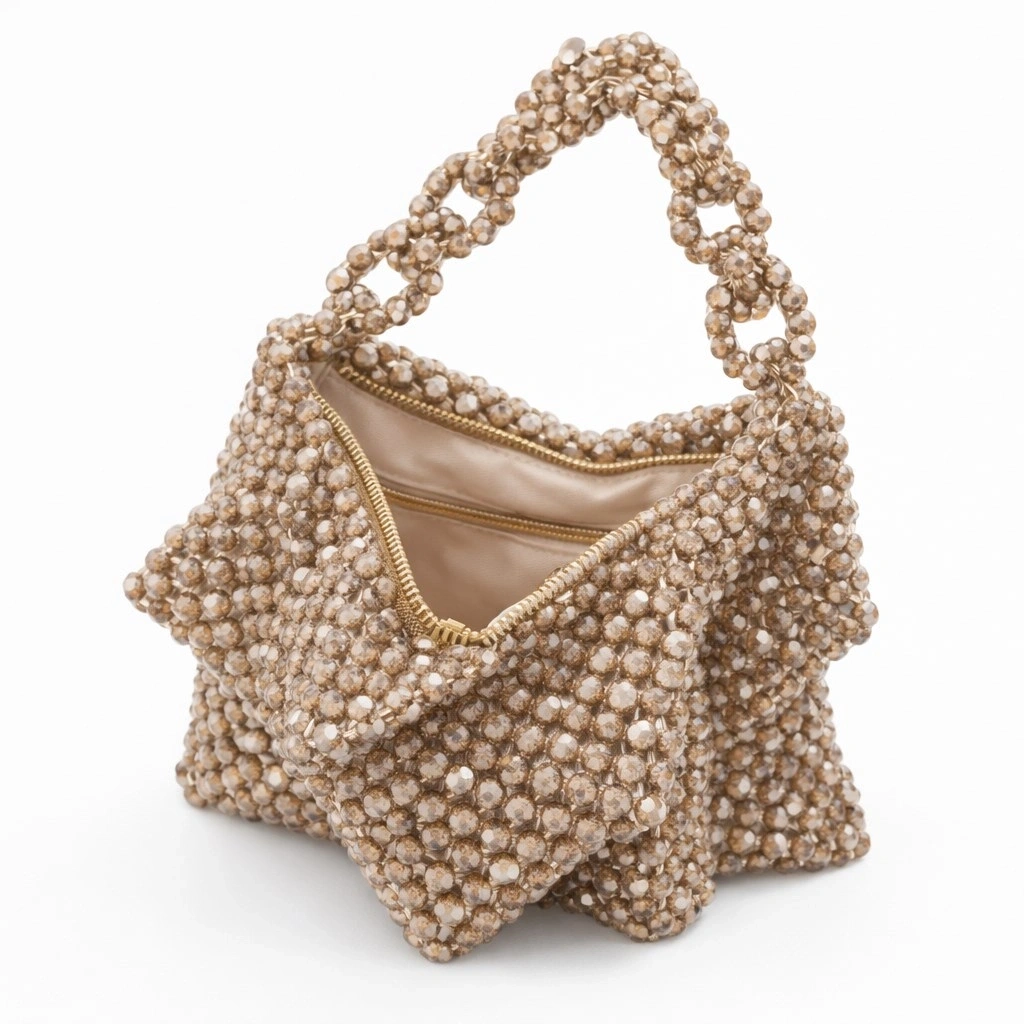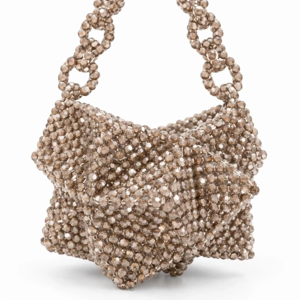 Çanta gövdesi, 8 mm standart yuvarlak kesim optik kristal boncukların, yüksek mukavemetli monofilament misina kullanılarak tek tek örülmesiyle tamamen el işçiliğiyle oluşturulmuştur. Kristallerin homojen dizilimi sayesinde yüzey boyunca kesintisiz bir ışık kırılımı elde edilirken, örgü yoğunluğu çantanın kendi kendini taşıyabilen dengeli bir strüktür kazanmasını sağlar.