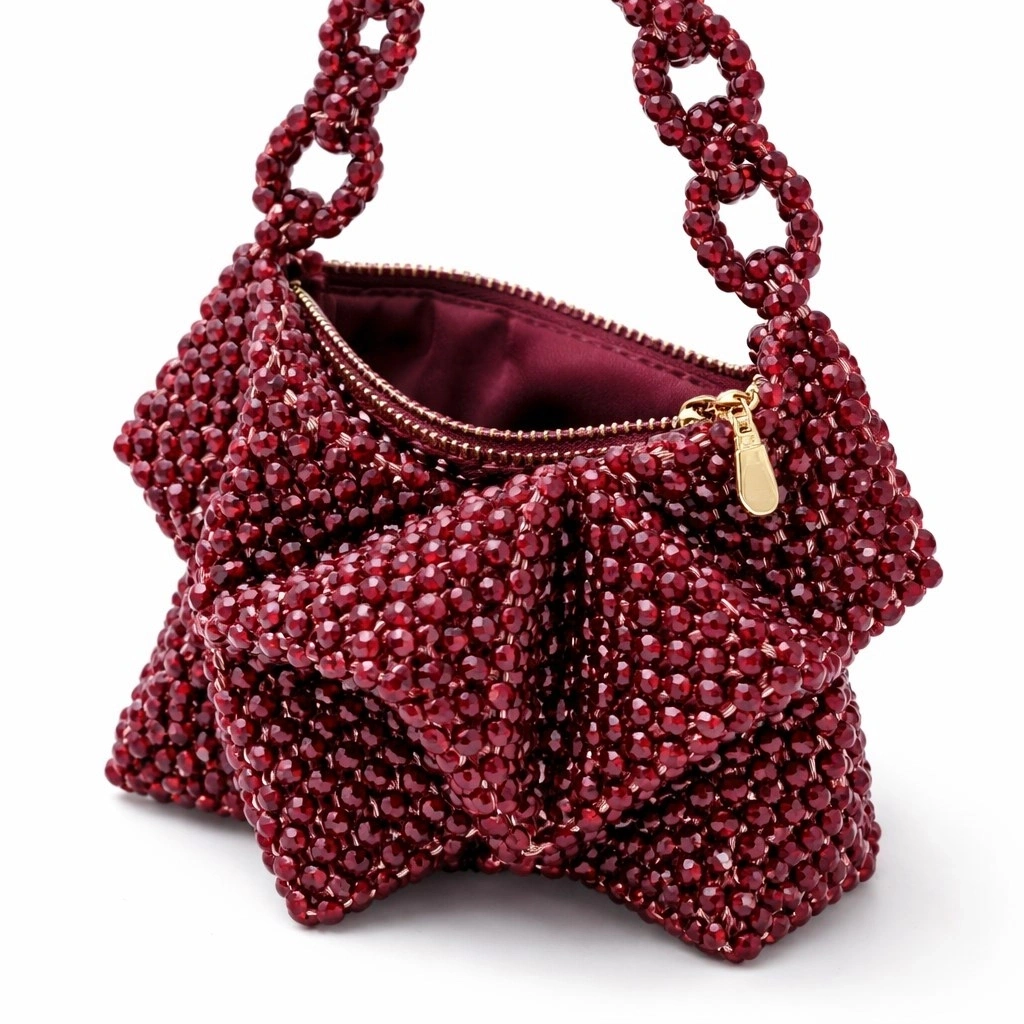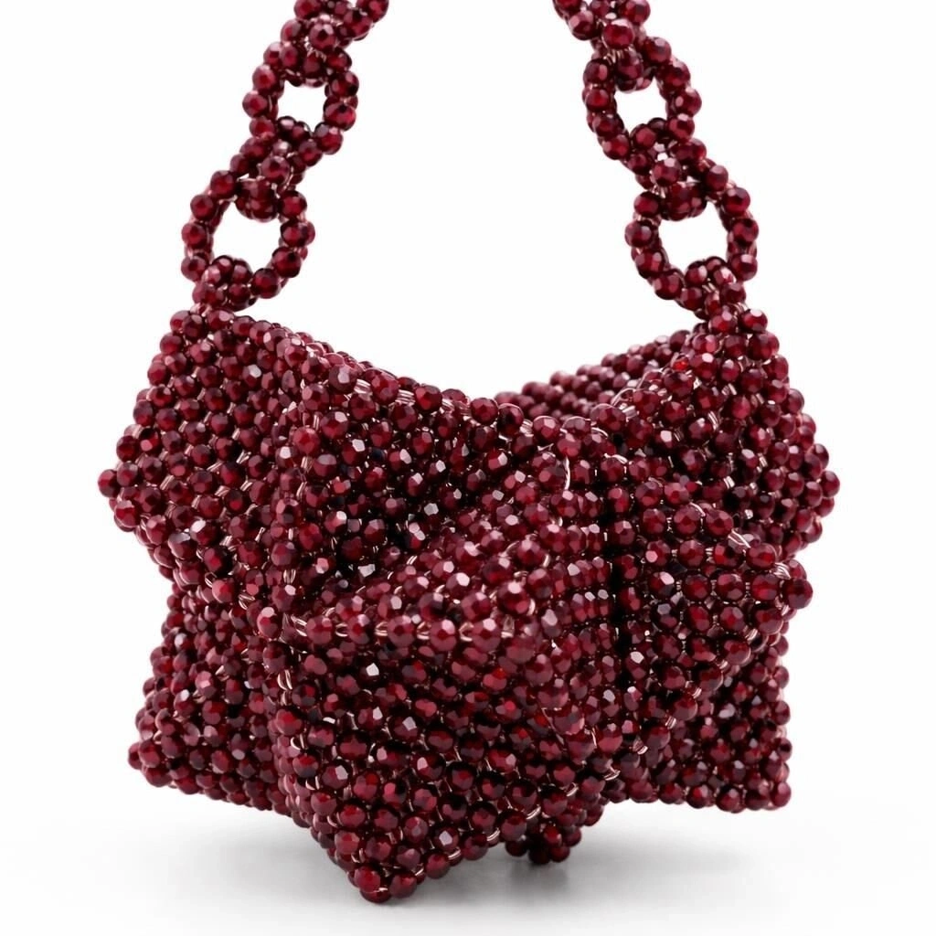 Çanta gövdesi, 8 mm standart yuvarlak kesim optik kristal boncukların, yüksek mukavemetli monofilament misina kullanılarak tek tek örülmesiyle tamamen el işçiliğiyle oluşturulmuştur. Kristallerin homojen dizilimi sayesinde yüzey boyunca kesintisiz bir ışık kırılımı elde edilirken, örgü yoğunluğu çantanın kendi kendini taşıyabilen dengeli bir strüktür kazanmasını sağlar.