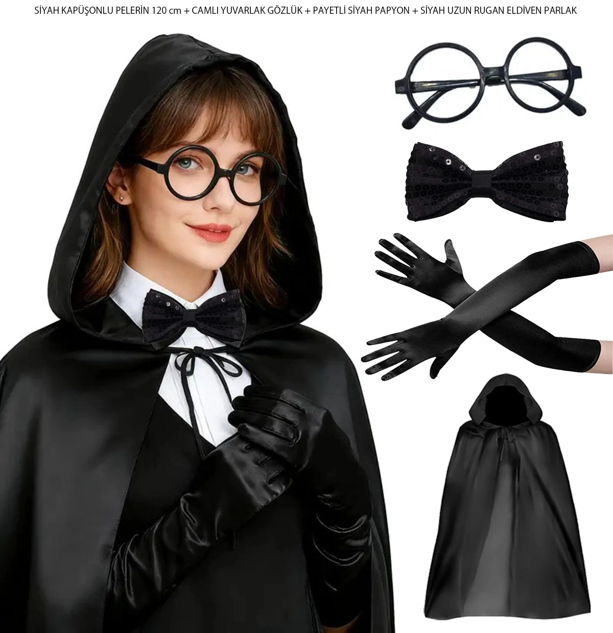 SİYAH KAPÜŞONLU BÜYÜCÜ VE CADI PELERİN KOSTÜM SETİ (4 PARÇA)Ürün ÖzellikleriSiyah Kapüşonlu Büyücü ve Cadı Pelerin Kostüm Seti, sahne gösterileri, temalı partiler ve kostüm etkinlikleri için tasarlanmış dikkat çekici ve tamamlayıcı bir kostüm setidir. 120 cm uzunluğundaki kapüşonlu pelerin, cadı ve büyücü temalı kostümlere güçlü bir karakter kazandırırken akıcı yapısı sayesinde sahnede etkileyici bir görünüm oluşturur. Kaliteli jarse kumaştan üretilmiş olan bu kapüşonlu büyücü pelerini, hafif ve konforlu yapısı sayesinde uzun süreli kullanımlarda rahatlık sunar. Set içerisinde yer alan camlı yuvarlak gözlük, karakterinize klasik büyücü stilini kazandıran eğlenceli bir aksesuar olarak öne çıkar. Işıltılı detaylara sahip payetli siyah papyon kostüme şık bir dokunuş katarken, parlak görünümlü uzun siyah eldivenler ise kombinlerin tamamlayıcı parçası olarak dikkat çeker. Hem yetişkinler hem de genç kullanıcılar için uygun olan bu büyücü kostüm seti, cosplay etkinlikleri, sahne performansları, temalı partiler ve fotoğraf çekimleri için ideal bir cadı kostüm aksesuar seti seçeneğidir.Ürün Teknik ÖzellikleriÖzellikAçıklamaÜrün AdıSiyah Kapüşonlu Büyücü ve Cadı Pelerin Kostüm SetiPelerin Uzunluğu120 cmPelerin RengiSiyahPelerin MalzemesiJarse KumaşGözlük TipiCamlı Yuvarlak Kostüm GözlüğüPapyonSiyah Payetli PapyonEldivenUzun Siyah Parlak EldivenKullanım AlanıKostüm Partisi, Sahne Gösterisi, Cosplay, Temalı EtkinlikPaket İçeriği1 Adet Siyah Kapüşonlu Pelerin (120 cm)1 Adet Yuvarlak Kostüm Gözlüğü1 Adet Siyah Payetli Papyon1 Çift Siyah Uzun Eldiven
