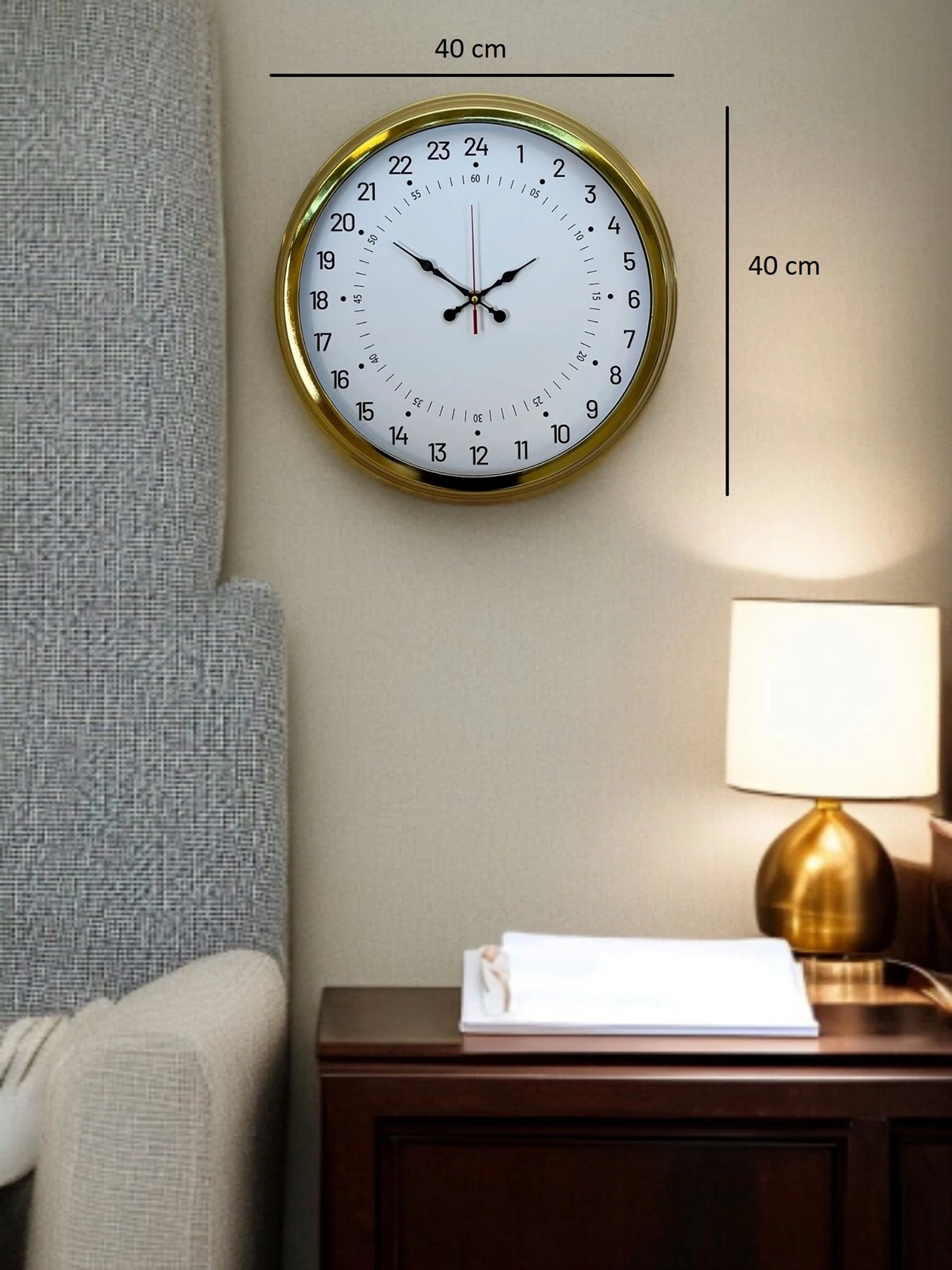 Zarif tasarımı ve gold rengin asaletiyle öne çıkan 40 cm Gold Lüks Duvar Saati, yaşam alanlarınıza hem şıklık hem de işlevsellik katar. Modern ve klasik çizgileri bir arada sunan bu özel tasarım; salon, ofis, mutfak, antre ve çalışma alanları için ideal bir dekoratif tamamlayıcıdır.
