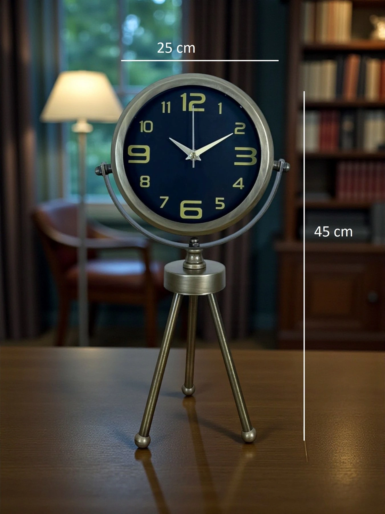 Modern çizgiler ile vintage detayları bir arada sunan bu 45 x 25 cm eskitme tripod masa saati, hem dekoratif hem de fonksiyonel bir ürün arayanlar için mükemmel bir seçenektir. Tamamen metal malzemeden üretilen gövdesi ve üç ayaklı tripod tasarımı, saate güçlü bir duruş ve uzun ömürlü bir dayanıklılık sağlar. Eskitme bronz kaplaması ise ürüne sıcak, elegan ve zamansız bir hava kazandırır.