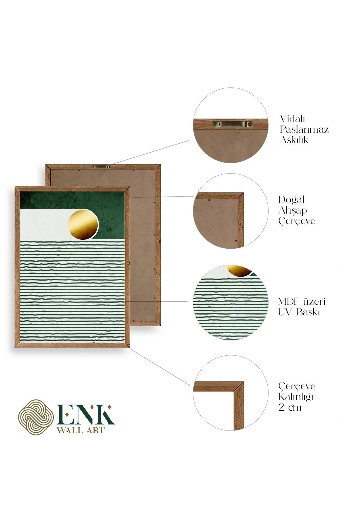 Tablolarımız gerçek ahşap çerçevelidir, çerçeve görünümlü değildir. ; ENK Wall Art Olarak Ahşap Çerçeveli Tablolar Üretiyoruz. ; Tablolarımız tek parça, 3 Parça, 5 Parça ve daha çok kategoride tasarımcılarımız tarafından ev ve ofisleriniz duvarları süslemek için tasarlanmaktadır. ; Ahşap Çerçeveli Duvar Tabloları ile yaşam alanlarınıza yepyeni bir görünüm kazandırın. ; Yıllarca dayanacağından emin olduğumuz sağlam çerçevelere sahip yüksek kaliteli ahşaptan üretilmiştir. ; İster bir köşeyi süslemek isteyin, ister evinizi yenilemek , bu ahşap tablolar herhangi bir yaşam alanına stil ve işlev getirecektir. ; Duvara kolay bir şekilde monte edilir. ; Uzun ömürlü kullanım için sağlam ahşap çerçeveden yapılmış, dayanıklı ve güçlü. ; Duvara monte edilebilir tasarımı, yaşam alanlarında veya yatak odalarında duvara kolayca asılmasını sağlar. ; Pürüzsüz üst yüzeyi temiz kalmayı kolaylaştırır. ; Herhangi bir stile uyacak şekilde çeşitli renklerde gelir. ; Kolay yeniden düzenleme için hafif ve portatif. ; Küçük oturma odaları veya dar alanlar için mükemmel boyut. ; Eve taşınma hediyesi olarak idealdir. ; Herhangi bir evin dekorunu süslemek için harika bir yol. ; Herhangi bir modern veya çağdaş iç tasarıma mükemmel bir katkı. ; Tablo içi 3 mm mdf (ahşap) malzeme üzeri uv baskıdır. ; Renkler canlı ve solma yapmaz. ; Kırılma, bükülme ve çizilmeye karşı dayanıklıdır.;