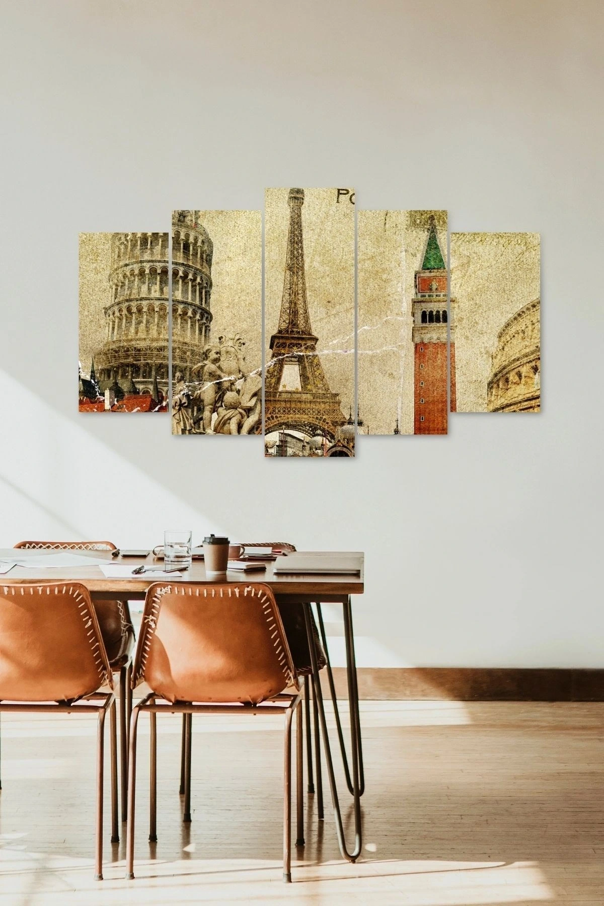 Modern tasarımıyla dikkat çeken bu 5 parçalı MDF tablo, mekanınıza şıklık ve estetik bir dokunuş katıyor; Ahşap malzemesi sayesinde dayanıklılık ve uzun ömürlü kullanım sunar; Her bir parça, tarihi mekanların özgün tasarımlarını yansıtarak evinizin dekorasyonuna kültürel bir derinlik kazandırır;