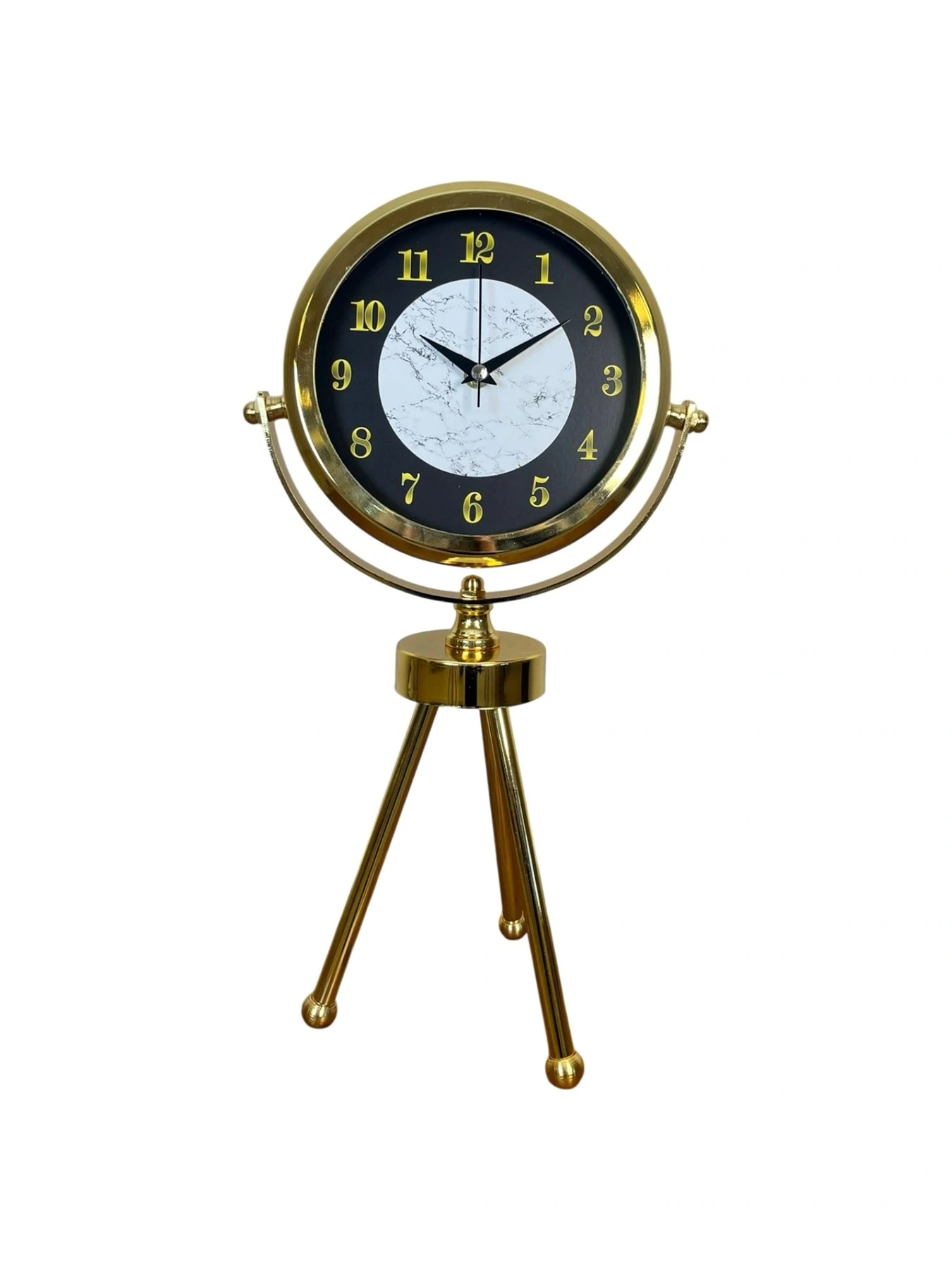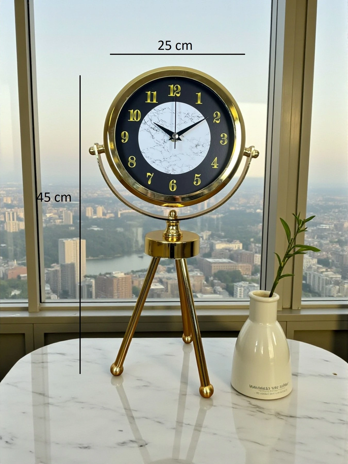 45 x 25 cm ölçülerindeki bu şık gold üç ayaklı masa saati, modern ve zarif tasarımıyla bulunduğu ortama premium bir görünüm kazandırır. Gerçek cam korumalı kadranı sayesinde hem net bir görünüm sunar hem de darbelere karşı daha dayanıklıdır. Metal tripod ayak yapısı ile dekoratif bir obje olarak da dikkat çeker. Sessiz çalışan mekanizmasıyla ev, ofis ve çalışma alanlarında keyifli bir kullanım sağlar.