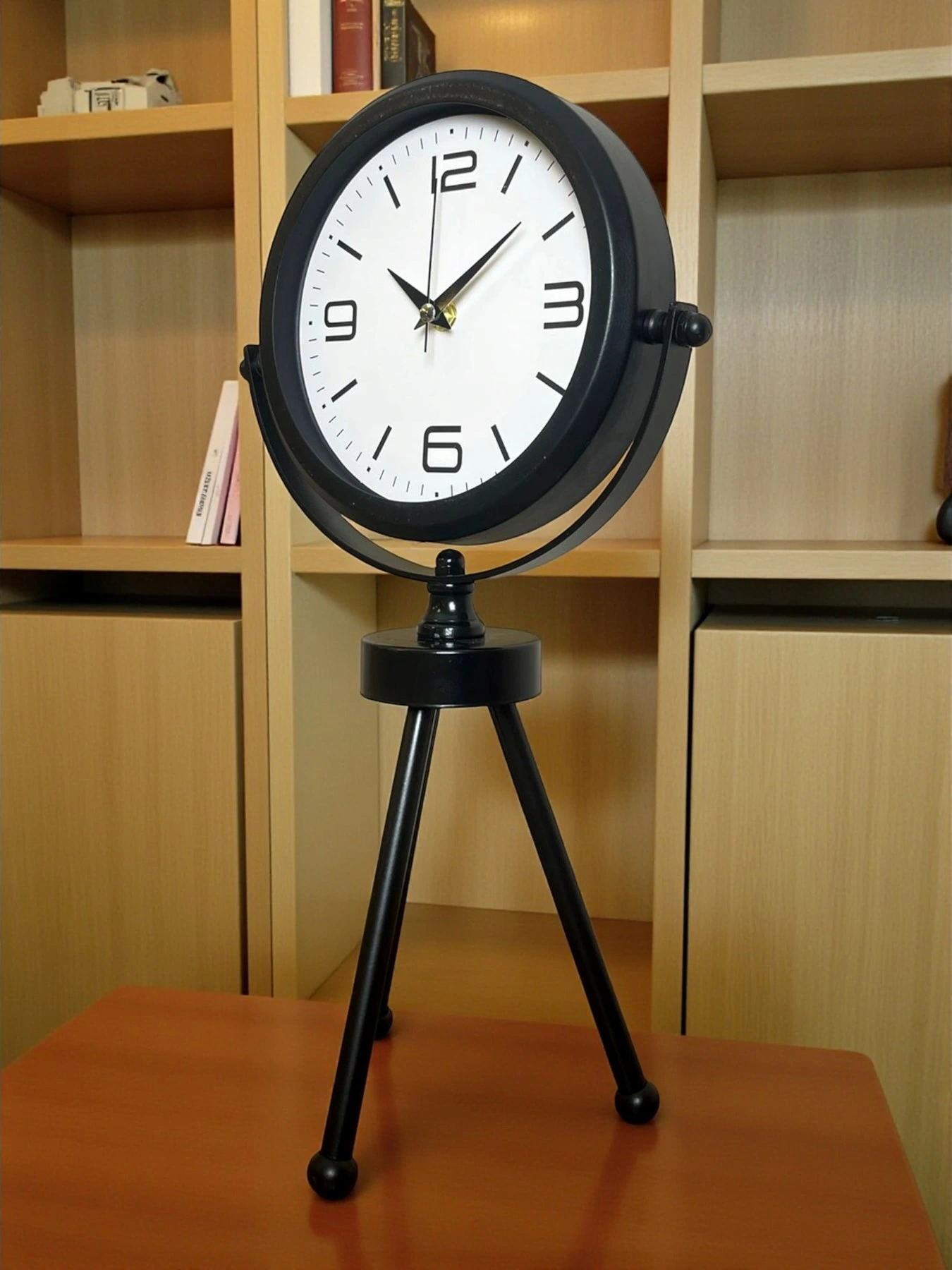 45 x 25 cm ölçülerindeki bu modern siyah üç ayaklı masa saati, minimal tasarımı ve güçlü duruşuyla her ortama şıklık katar. Gerçek cam korumalı kadranı sayesinde net görüntü ve uzun ömürlü kullanım sağlar. Tamamen metal gövdesi ve tripod ayak yapısıyla sağlam, dekoratif ve premium bir görünüm sunar. Sessiz akar saniye mekanizmasıyla ev, ofis ve çalışma alanlarında rahatsızlık vermeden kullanılabilir.
