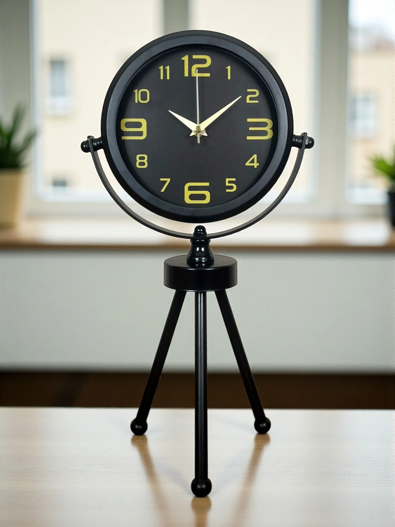 45 x 25 cm ölçülerindeki bu modern siyah üç ayaklı masa saati, minimal tasarımı ve güçlü duruşuyla her ortama şıklık katar. Gerçek cam korumalı kadranı sayesinde net görüntü ve uzun ömürlü kullanım sağlar. Tamamen metal gövdesi ve tripod ayak yapısıyla sağlam, dekoratif ve premium bir görünüm sunar. Sessiz akar saniye mekanizmasıyla ev, ofis ve çalışma alanlarında rahatsızlık vermeden kullanılabilir.